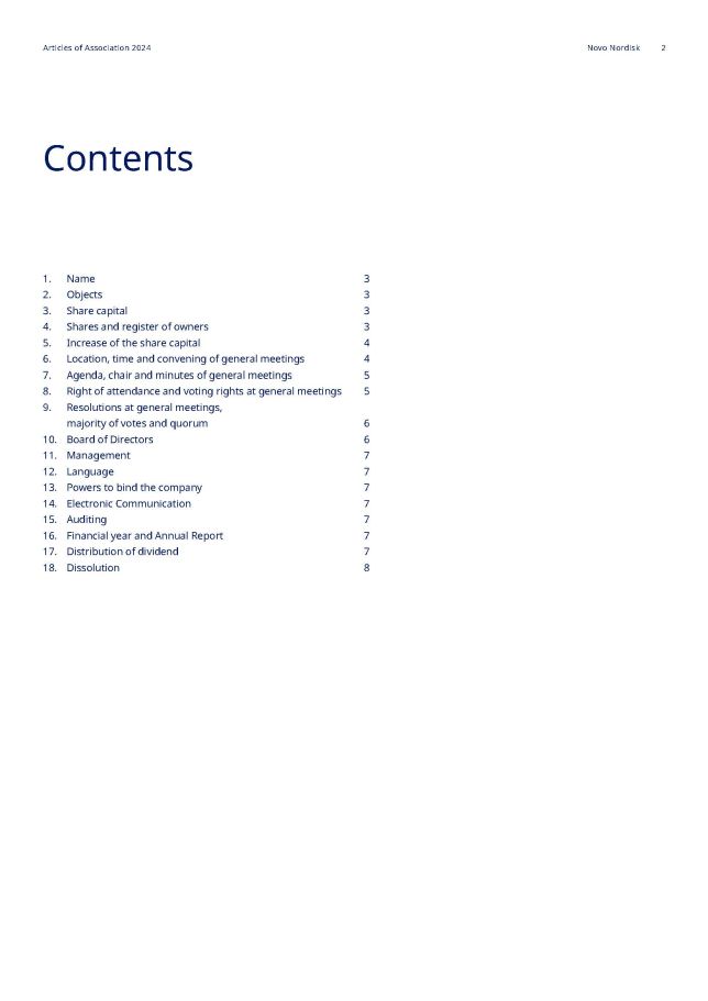 Contents 1. Name 2. Objects 3. Share capital 4. Shares and register of owners 5. Increase of the share capital 6. Location, time and convening of general meetings 7. Agenda, chair and minutes of general meetings 8. Right of attendance and voting rights at general meetings 9. Resolutions at general meetings, majority of votes and quorum 10. Board of Directors 11. Management 12. Language 13. Powers to bind the company 14. Electronic Communication 15. Auditing 16. Financial year and Annual Report 17. Distribution of dividend 18. Dissolution 3 3 3 3 4 4 5 5 6 6 7 7 7 7 7 7 7 8 Articles of Association 2024 Novo Nordisk 2