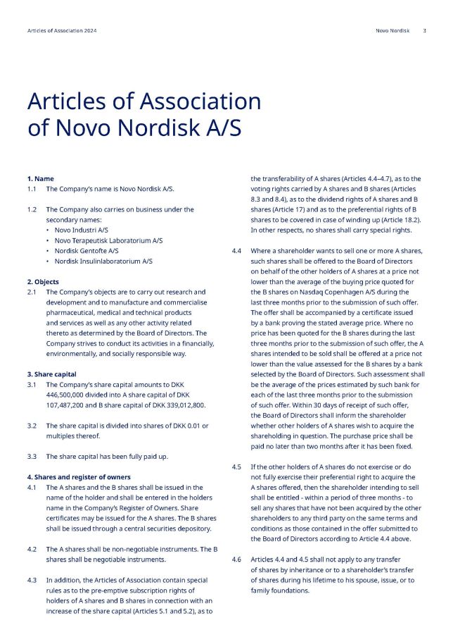 Articles of Association of Novo Nordisk A/S 1. Name 1. The Company’s name is Novo Nordisk A/S. 1.2 The Company also carries on business under the secondary names: • Novo Industri A/S • Novo Terapeutisk Laboratorium A/S • Nordisk Gentofte A/S • Nordisk Insulinlaboratorium A/S 2. Objects 2 . 1 The Company’s objects are to carry out research and development and to manufacture and commercialise pharmaceutical, medical and technical products and services as well as any other activity related thereto as determined by the Board of Directors. The Company strives to conduct its activities in a financially, environmentally, and socially responsible way. 3. Share capital 3.1 The Company’s share capital amounts to DKK 446,500,000 divided into A share capital of DKK 107,487,200 and B share capital of DKK 339,012,800. 3.2 The share capital is divided into shares of DKK 0.01 or multiples thereof. 3.3 The share capital has been fully paid up. 4. Shares and register of owners 4.1 The A shares and the B shares shall be issued in the name of the holder and shall be entered in the holders name in the Company’s Register of Owners. Share certificates may be issued for the A shares. The B shares shall be issued through a central securities depository. 4.2 The A shares shall be non - negotiable instruments. The B shares shall be negotiable instruments. 4.3 In addition, the Articles of Association contain special rules as to the pre - emptive subscription rights of holders of A shares and B shares in connection with an increase of the share capital (Articles 5.1 and 5.2), as to the transferability of A shares (Articles 4.4 – 4.7), as to the voting rights carried by A shares and B shares (Articles 8.3 and 8.4), as to the dividend rights of A shares and B shares (Article 17) and as to the preferential rights of B shares to be covered in case of winding up (Article 18.2). In other respects, no shares shall carry special rights. 4.4 Where a shareholder wants to sell one or more A shares, such shares shall be offered to the Board of Directors on behalf of the other holders of A shares at a price not lower than the average of the buying price quoted for the B shares on Nasdaq Copenhagen A/S during the last three months prior to the submission of such offer. The offer shall be accompanied by a certificate issued by a bank proving the stated average price. Where no price has been quoted for the B shares during the last three months prior to the submission of such offer, the A shares intended to be sold shall be offered at a price not lower than the value assessed for the B shares by a bank selected by the Board of Directors. Such assessment shall be the average of the prices estimated by such bank for each of the last three months prior to the submission of such offer. Within 30 days of receipt of such offer, the Board of Directors shall inform the shareholder whether other holders of A shares wish to acquire the shareholding in question. The purchase price shall be paid no later than two months after it has been fixed. 4.5 If the other holders of A shares do not exercise or do not fully exercise their preferential right to acquire the A shares offered, then the shareholder intending to sell shall be entitled - within a period of three months - to sell any shares that have not been acquired by the other shareholders to any third party on the same terms and conditions as those contained in the offer submitted to the Board of Directors according to Article 4.4 above. 4 . 6 Articles 4 . 4 and 4 . 5 shall not apply to any transfer of shares by inheritance or to a shareholder’s transfer of shares during his lifetime to his spouse, issue, or to family foundations . Articles of Association 2024 Novo Nordisk 3
