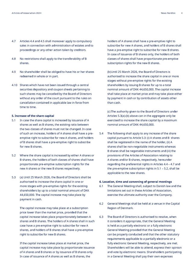 4.7 Articles 4.4 and 4.5 shall moreover apply to compulsory sales in connection with administration of estates and to proceedings or any other action taken by creditors. 4.8 No restrictions shall apply to the transferability of B shares. 4.9 No shareholder shall be obliged to have his or her shares redeemed in whole or in part. 4.10 Shares which have not been issued through a central securities depository and coupon sheets pertaining to such shares may be cancelled by the Board of Directors without any order of the court pursuant to the rules on cancellation contained in applicable law in force from time to time. 5. Increase of the share capital 5.1 In case the share capital is increased by issuance of A shares as well as B shares, the existing ratio between the two classes of shares must not be changed. In case of such an increase, holders of A shares shall have a pre - emptive right to subscribe for new A shares, and holders of B shares shall have a pre - emptive right to subscribe for new B shares. 5.2 Where the share capital is increased by either A shares or B shares, the holders of both classes of shares shall have proportionate pre - emptive subscription rights for the new A shares or the new B shares respectively. 5.3 (a) Until 25 March 2026, the Board of Directors shall be authorised to increase the share capital in one or more stages with pre - emptive rights for the existing shareholders by up to a total nominal amount of DKK 44,650,000. The capital increase may take place by payment in cash. The capital increase may take place at a subscription price lower than the market price, provided that the capital increase takes place proportionately between A shares and B shares. The holders of A shares shall in such case have a pre - emptive right to subscribe for new A shares, and holders of B shares shall have a pre - emptive right to subscribe for new B shares. If the capital increase takes place at market price, the capital increase may take place by proportionate issuance of A shares and B shares or by issuance of B shares only. In case of issuance of A shares as well as B shares, the holders of A shares shall have a pre - emptive right to subscribe for new A shares, and holders of B shares shall have a pre - emptive right to subscribe for new B shares. In case of issuance of B shares only, the holders of both classes of shares shall have proportionate pre - emptive subscription rights for the new B shares. (b) Until 25 March 2026, the Board of Directors is authorised to increase the share capital in one or more stages without pre - emptive rights for the existing shareholders by issuing B shares for up to a total nominal amount of DKK 44,650,000. The capital increase shall take place at market price and may take place either by payment in cash or by contribution of assets other than cash. (c) The authority given to the Board of Directors under Articles 5.3(a) - (b) above can in the aggregate only be exercised to increase the share capital by a maximum nominal amount of DKK 44,650,000. 5.4 The following shall apply to any increase of the share capital pursuant to Article 5.3: (i) A shares and B shares shall be registered in the name of the holder, (ii) A shares shall be non - negotiable instruments whereas B shares shall be negotiable instruments and (iii) the provisions of the Articles of Association relating to A shares and/or B shares, respectively, hereunder regarding the preferential rights in Articles 4.4 – 4.7 and the pre - emptive subscription rights in 5.1 – 5.2, shall be applicable to the new shares. 6. Location, time and convening of general meetings 6.1 The General Meeting shall, subject to Danish law and the limitations set out in these Articles of Association, exercise the ultimate authority over the Company. 6.2 General Meetings shall be held at a venue in the Capital Region of Denmark. 6.3 The Board of Directors is authorised to resolve, when it considers it appropriate, that the General Meeting is held as a partially electronic or a fully electronic General Meeting provided that the General Meeting can be properly conducted and that the other statutory requirements applicable to a partially electronic or a fully electronic General Meeting, respectively, are met. Shareholders will be able to attend, express their opinion and vote by electronic means . Shareholders participating in a General Meeting shall pay their own expenses Articles of Association 2024 Novo Nordisk 4