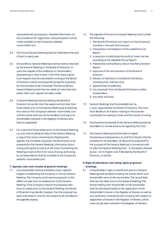 associated with participation. Detailed information on the procedures for registration and participation will be made available on the Company’s website: novonordisk.com. 6.4 The Annual General Meeting shall be held before the end of April in every year. 6.5 Extraordinary General Meetings shall be held as resolved by the General Meeting or the Board of Directors, or upon the request of the auditor(s) or shareholders representing in total at least 1/20 of the share capital. Such request shall be submitted in writing to the Board of Directors and be accompanied by specific proposals for the business to be transacted. The Extraordinary General Meeting shall then be called not later than two weeks after such request has been made. 6.6 A General Meeting shall be called by the Board of Directors not earlier than five weeks and not later than three weeks prior to the General Meeting by publishing the notice at the Company’s website: novonordisk.com and the notice shall also be forwarded in writing to all shareholders entered in the Register of Owners who have so requested. 6.7 For a period of three weeks prior to the General Meeting up until and including the day of the General Meeting, a copy of the notice convening the Meeting with agenda, the complete proposals, the documents to be presented at the General Meeting, information about voting and capital structure at the time of convening the Meeting as well as forms for issue of proxy and voting by correspondence shall be available at the Company’s website: novonordisk.com. 7. Agenda, chair and minutes of general meetings 7.1 Any shareholder shall be entitled to have a specific subject considered by the Company in Annual General Meeting. The Company shall receive proposals to this effect not later than six weeks prior to the General Meeting. If the Company receives the proposal later than six weeks prior to the General Meeting, the Board of Directors may decide, however, that the proposal has been submitted in time for the subject to be included on the agenda anyway. 2. The agenda of the Annual General Meeting shall include the following: 1. The Board of Directors’ oral report on the Company’s activities in the past financial year. 2. Presentation and adoption of the audited Annual Report. 3. A resolution to distribute the profit or cover the loss according to the adopted Annual Report. 4. Presentation and advisory vote on the Remuneration Report. 5. Approval of the remuneration of the Board of Directors. 6. Election of members to the Board of Directors, including chair and vice chair. 7. Appointment of auditor(s). 8. Any proposals from the Board of Directors and/or shareholders. 9. Any other business. 7.3 General Meetings shall be presided over by a chair, appointed by the Board of Directors. The chair shall decide on all matters relating to the business transacted, the casting of votes and the results of voting. 7.4 The business transacted at the General Meeting shall be recorded in a minute book to be signed by the chair. 7.5 The General Meeting shall be held in English. Simultaneous interpretation to and from Danish shall be available for all attendees. All documents prepared for the purpose of the General Meeting in connection with or after the General Meeting shall – to the extent allowed by law – be in English and, if decided by the Board of Directors, in Danish. 8. Right of attendance and voting rights at general meetings 8.1 A shareholder’s right to attend and vote at a General Meeting shall be determined by the shares which such shareholder owns at the record date. The record date shall be one week prior to the General Meeting. The shares held by each shareholder at the record date shall be calculated based on the registration of the shareholder’s shares in the Register of Owners as well as any notification received by the Company with respect to registration of shares in the Register of Owners, which have not yet been entered in the Register of Owners. Articles of Association 2024 Novo Nordisk 5