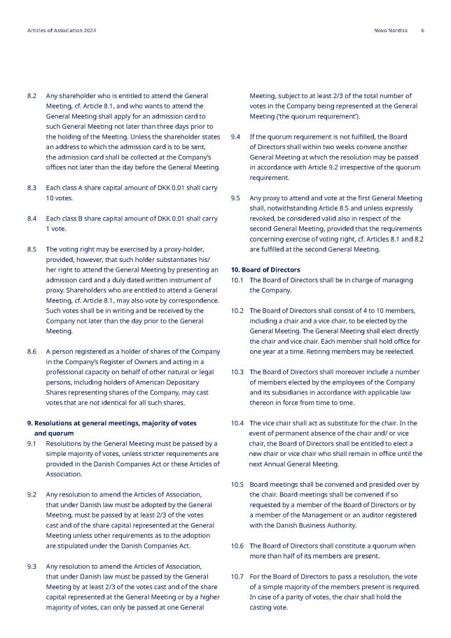 8.2 Any shareholder who is entitled to attend the General Meeting, cf. Article 8.1, and who wants to attend the General Meeting shall apply for an admission card to such General Meeting not later than three days prior to the holding of the Meeting. Unless the shareholder states an address to which the admission card is to be sent, the admission card shall be collected at the Company’s offices not later than the day before the General Meeting. 8.3 Each class A share capital amount of DKK 0.01 shall carry 10 votes. 8.4 Each class B share capital amount of DKK 0.01 shall carry 1 vote. 8.5 The voting right may be exercised by a proxy - holder, provided, however, that such holder substantiates his/ her right to attend the General Meeting by presenting an admission card and a duly dated written instrument of proxy. Shareholders who are entitled to attend a General Meeting, cf. Article 8.1, may also vote by correspondence. Such votes shall be in writing and be received by the Company not later than the day prior to the General Meeting. 8.6 A person registered as a holder of shares of the Company in the Company’s Register of Owners and acting in a professional capacity on behalf of other natural or legal persons, including holders of American Depositary Shares representing shares of the Company, may cast votes that are not identical for all such shares. 9. Resolutions at general meetings, majority of votes and quorum 9 . 1 Resolutions by the General Meeting must be passed by a simple majority of votes, unless stricter requirements are provided in the Danish Companies Act or these Articles of Association . 9.2 Any resolution to amend the Articles of Association, that under Danish law must be adopted by the General Meeting, must be passed by at least 2/3 of the votes cast and of the share capital represented at the General Meeting unless other requirements as to the adoption are stipulated under the Danish Companies Act. 9.3 Any resolution to amend the Articles of Association, that under Danish law must be passed by the General Meeting by at least 2/3 of the votes cast and of the share capital represented at the General Meeting or by a higher majority of votes, can only be passed at one General Meeting, subject to at least 2/3 of the total number of votes in the Company being represented at the General Meeting (‘the quorum requirement’). 9.4 If the quorum requirement is not fulfilled, the Board of Directors shall within two weeks convene another General Meeting at which the resolution may be passed in accordance with Article 9.2 irrespective of the quorum requirement. 9.5 Any proxy to attend and vote at the first General Meeting shall, notwithstanding Article 8.5 and unless expressly revoked, be considered valid also in respect of the second General Meeting, provided that the requirements concerning exercise of voting right, cf. Articles 8.1 and 8.2 are fulfilled at the second General Meeting. 10. Board of Directors 10.1 The Board of Directors shall be in charge of managing the Company. 10.2 The Board of Directors shall consist of 4 to 10 members, including a chair and a vice chair, to be elected by the General Meeting. The General Meeting shall elect directly the chair and vice chair. Each member shall hold office for one year at a time. Retiring members may be reelected. 10.3 The Board of Directors shall moreover include a number of members elected by the employees of the Company and its subsidiaries in accordance with applicable law thereon in force from time to time. 10.4 The vice chair shall act as substitute for the chair. In the event of permanent absence of the chair and/ or vice chair, the Board of Directors shall be entitled to elect a new chair or vice chair who shall remain in office until the next Annual General Meeting. 10.5 Board meetings shall be convened and presided over by the chair. Board meetings shall be convened if so requested by a member of the Board of Directors or by a member of the Management or an auditor registered with the Danish Business Authority. 10.6 The Board of Directors shall constitute a quorum when more than half of its members are present. 10.7 For the Board of Directors to pass a resolution, the vote of a simple majority of the members present is required. In case of a parity of votes, the chair shall hold the casting vote. Articles of Association 2024 Novo Nordisk 6
