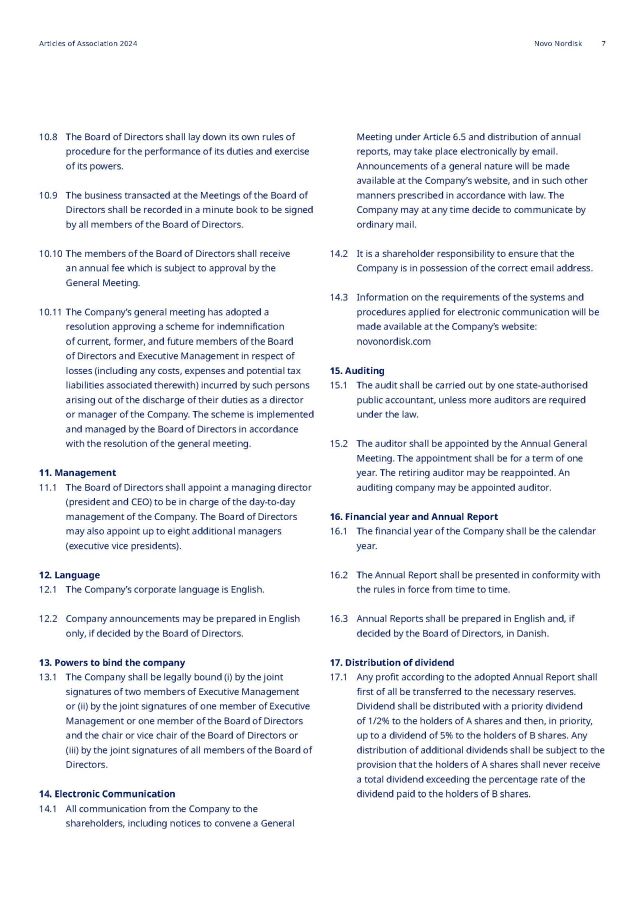 10.8 The Board of Directors shall lay down its own rules of procedure for the performance of its duties and exercise of its powers. 10.9 The business transacted at the Meetings of the Board of Directors shall be recorded in a minute book to be signed by all members of the Board of Directors. 10.10 The members of the Board of Directors shall receive an annual fee which is subject to approval by the General Meeting. 10.11 The Company’s general meeting has adopted a resolution approving a scheme for indemnification of current, former, and future members of the Board of Directors and Executive Management in respect of losses (including any costs, expenses and potential tax liabilities associated therewith) incurred by such persons arising out of the discharge of their duties as a director or manager of the Company. The scheme is implemented and managed by the Board of Directors in accordance with the resolution of the general meeting. 11. Management 1. The Board of Directors shall appoint a managing director (president and CEO) to be in charge of the day - to - day management of the Company. The Board of Directors may also appoint up to eight additional managers (executive vice presidents). 12. Language 1. The Company’s corporate language is English. 12.2 Company announcements may be prepared in English only, if decided by the Board of Directors. 13. Powers to bind the company 1. The Company shall be legally bound (i) by the joint signatures of two members of Executive Management or (ii) by the joint signatures of one member of Executive Management or one member of the Board of Directors and the chair or vice chair of the Board of Directors or (iii) by the joint signatures of all members of the Board of Directors. 14. Electronic Communication 1. All communication from the Company to the shareholders, including notices to convene a General Meeting under Article 6.5 and distribution of annual reports, may take place electronically by email. Announcements of a general nature will be made available at the Company’s website, and in such other manners prescribed in accordance with law. The Company may at any time decide to communicate by ordinary mail. 14.2 It is a shareholder responsibility to ensure that the Company is in possession of the correct email address. 14.3 Information on the requirements of the systems and procedures applied for electronic communication will be made available at the Company’s website: novonordisk.com 15. Auditing 15 . 1 The audit shall be carried out by one state - authorised public accountant, unless more auditors are required under the law . 15.2 The auditor shall be appointed by the Annual General Meeting. The appointment shall be for a term of one year. The retiring auditor may be reappointed. An auditing company may be appointed auditor. 16. Financial year and Annual Report 16.1 The financial year of the Company shall be the calendar year. 16.2 The Annual Report shall be presented in conformity with the rules in force from time to time. 16.3 Annual Reports shall be prepared in English and, if decided by the Board of Directors, in Danish. 17. Distribution of dividend 17.1 Any profit according to the adopted Annual Report shall first of all be transferred to the necessary reserves. Dividend shall be distributed with a priority dividend of 1/2% to the holders of A shares and then, in priority, up to a dividend of 5% to the holders of B shares. Any distribution of additional dividends shall be subject to the provision that the holders of A shares shall never receive a total dividend exceeding the percentage rate of the dividend paid to the holders of B shares. Articles of Association 2024 Novo Nordisk 7