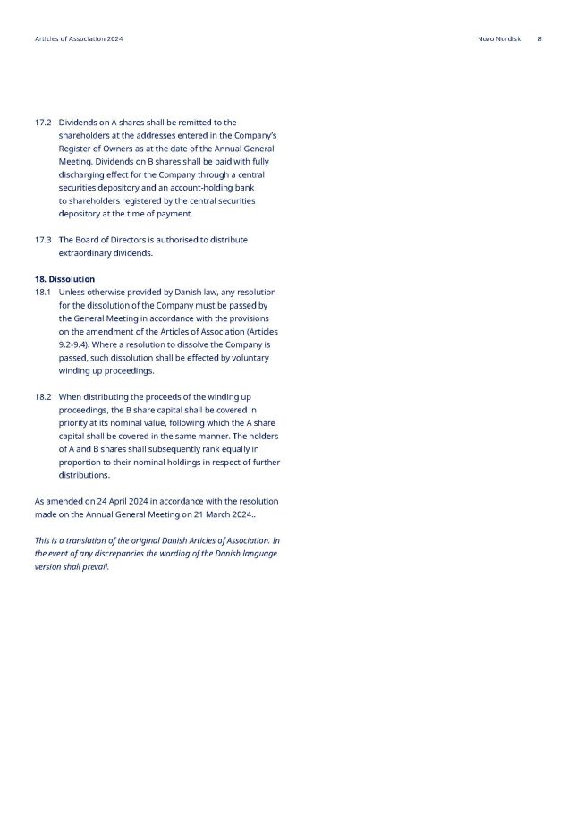 2. Dividends on A shares shall be remitted to the shareholders at the addresses entered in the Company’s Register of Owners as at the date of the Annual General Meeting. Dividends on B shares shall be paid with fully discharging effect for the Company through a central securities depository and an account - holding bank to shareholders registered by the central securities depository at the time of payment. 3. The Board of Directors is authorised to distribute extraordinary dividends. 18. Dissolution 1. Unless otherwise provided by Danish law, any resolution for the dissolution of the Company must be passed by the General Meeting in accordance with the provisions on the amendment of the Articles of Association (Articles 9.2 - 9.4). Where a resolution to dissolve the Company is passed, such dissolution shall be effected by voluntary winding up proceedings. 2. When distributing the proceeds of the winding up proceedings, the B share capital shall be covered in priority at its nominal value, following which the A share capital shall be covered in the same manner. The holders of A and B shares shall subsequently rank equally in proportion to their nominal holdings in respect of further distributions. As amended on 24 April 2024 in accordance with the resolution made on the Annual General Meeting on 21 March 2024.. This is a translation of the original Danish Articles of Association. In the event of any discrepancies the wording of the Danish language version shall prevail. Articles of Association 2024 Novo Nordisk 8
