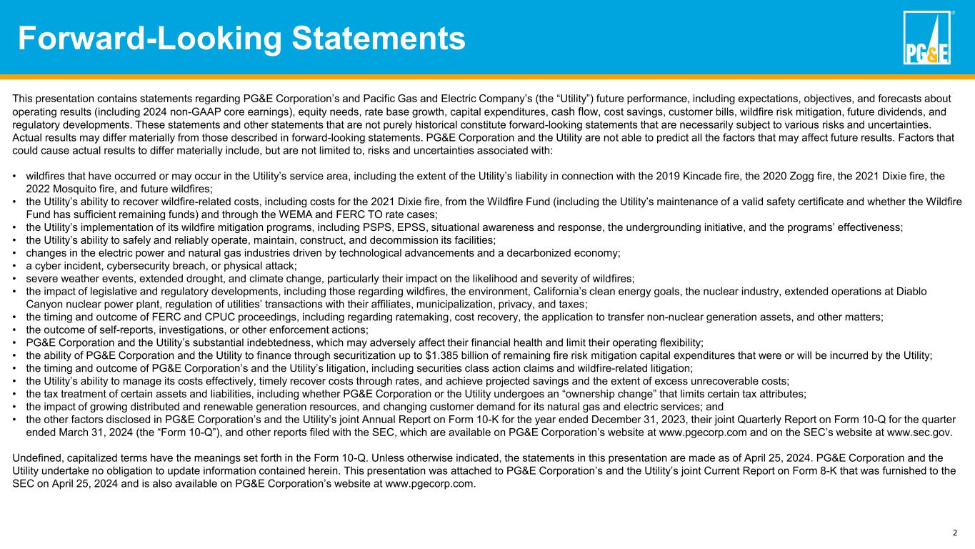 This Current Report on Form 8-K contains forward-looking statements that are not historical facts, including statements about the beliefs, expectations, estimates, future plans, and strategies of PG&E Corporation and the Utility, including regarding earnings, operating cost savings, capital investments, financings, and dividends. These statements are based on current expectations and assumptions, which management believes are reasonable, and on information currently available to management, but are necessarily subject to various risks and uncertainties. In addition to the risk that these assumptions prove to be inaccurate, factors that could cause actual results to differ materially from those contemplated by the forward-looking statements include factors disclosed in PG&E Corporation’s and the Utility’s Annual Report on Form 10-K for the year ended December 31, 2023, their most recent quarterly report on Form 10-Q for the quarter ended March 31, 2024, and other reports filed with the SEC’s which are available on PG&E Corporation’s website at www.pgecorp.com and on the SEC’s website at www.sec.gov. PG&E Corporation and the Utility undertake no obligation to publicly update or revise any forward-looking statements, whether due to new information, future events, or otherwise, except to the extent required by law.