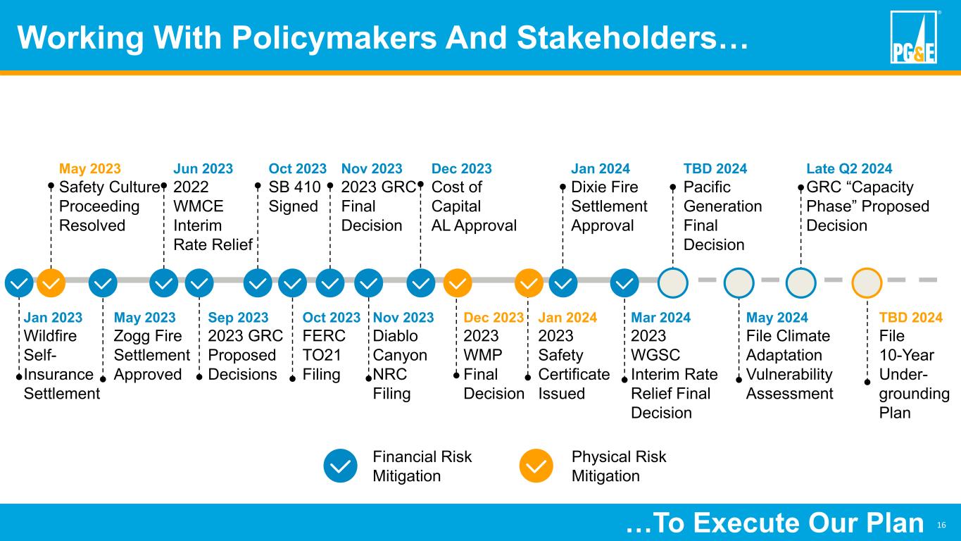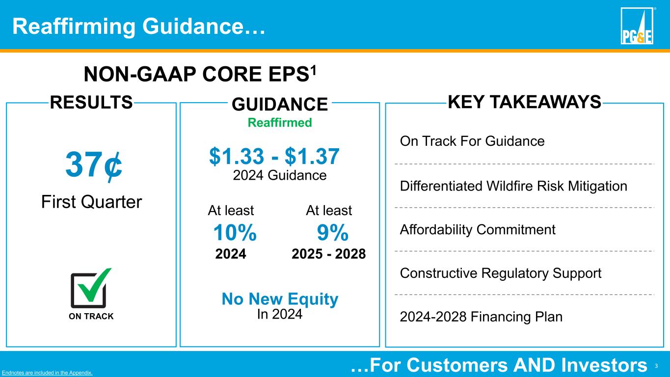 2 Forward-Looking Statements This presentation contains statements regarding PG&E Corporation’s and Pacific Gas and Electric Company’s (the “Utility”) future performance, including expectations, objectives, and forecasts about operating results (including 2024 non-GAAP core earnings), equity needs, rate base growth, capital expenditures, cash flow, cost savings, customer bills, wildfire risk mitigation, future dividends, and regulatory developments. These statements and other statements that are not purely historical constitute forward-looking statements that are necessarily subject to various risks and uncertainties. Actual results may differ materially from those described in forward-looking statements. PG&E Corporation and the Utility are not able to predict all the factors that may affect future results. Factors that could cause actual results to differ materially include, but are not limited to, risks and uncertainties associated with: • wildfires that have occurred or may occur in the Utility’s service area, including the extent of the Utility’s liability in connection with the 2019 Kincade fire, the 2020 Zogg fire, the 2021 Dixie fire, the 2022 Mosquito fire, and future wildfires; • the Utility’s ability to recover wildfire-related costs, including costs for the 2021 Dixie fire, from the Wildfire Fund (including the Utility’s maintenance of a valid safety certificate and whether the Wildfire Fund has sufficient remaining funds) and through the WEMA and FERC TO rate cases; • the Utility’s implementation of its wildfire mitigation programs, including PSPS, EPSS, situational awareness and response, the undergrounding initiative, and the programs’ effectiveness; • the Utility’s ability to safely and reliably operate, maintain, construct, and decommission its facilities; • changes in the electric power and natural gas industries driven by technological advancements and a decarbonized economy; • a cyber incident, cybersecurity breach, or physical attack; • severe weather events, extended drought, and climate change, particularly their impact on the likelihood and severity of wildfires; • the impact of legislative and regulatory developments, including those regarding wildfires, the environment, California’s clean energy goals, the nuclear industry, extended operations at Diablo Canyon nuclear power plant, regulation of utilities’ transactions with their affiliates, municipalization, privacy, and taxes; • the timing and outcome of FERC and CPUC proceedings, including regarding ratemaking, cost recovery, the application to transfer non-nuclear generation assets, and other matters; • the outcome of self-reports, investigations, or other enforcement actions; • PG&E Corporation and the Utility’s substantial indebtedness, which may adversely affect their financial health and limit their operating flexibility; • the ability of PG&E Corporation and the Utility to finance through securitization up to $1.385 billion of remaining fire risk mitigation capital expenditures that were or will be incurred by the Utility; • the timing and outcome of PG&E Corporation’s and the Utility’s litigation, including securities class action claims and wildfire-related litigation; • the Utility’s ability to manage its costs effectively, timely recover costs through rates, and achieve projected savings and the extent of excess unrecoverable costs; • the tax treatment of certain assets and liabilities, including whether PG&E Corporation or the Utility undergoes an “ownership change” that limits certain tax attributes; • the impact of growing distributed and renewable generation resources, and changing customer demand for its natural gas and electric services; and • the other factors disclosed in PG&E Corporation’s and the Utility’s joint Annual Report on Form 10-K for the year ended December 31, 2023, their joint Quarterly Report on Form 10-Q for the quarter ended March 31, 2024 (the “Form 10-Q”), and other reports filed with the SEC, which are available on PG&E Corporation’s website at www.pgecorp.com and on the SEC’s website at www.sec.gov. Undefined, capitalized terms have the meanings set forth in the Form 10-Q. Unless otherwise indicated, the statements in this presentation are made as of April 25, 2024. PG&E Corporation and the Utility undertake no obligation to update information contained herein. This presentation was attached to PG&E Corporation’s and the Utility’s joint Current Report on Form 8-K that was furnished to the SEC on April 25, 2024 and is also available on PG&E Corporation’s website at www.pgecorp.com.