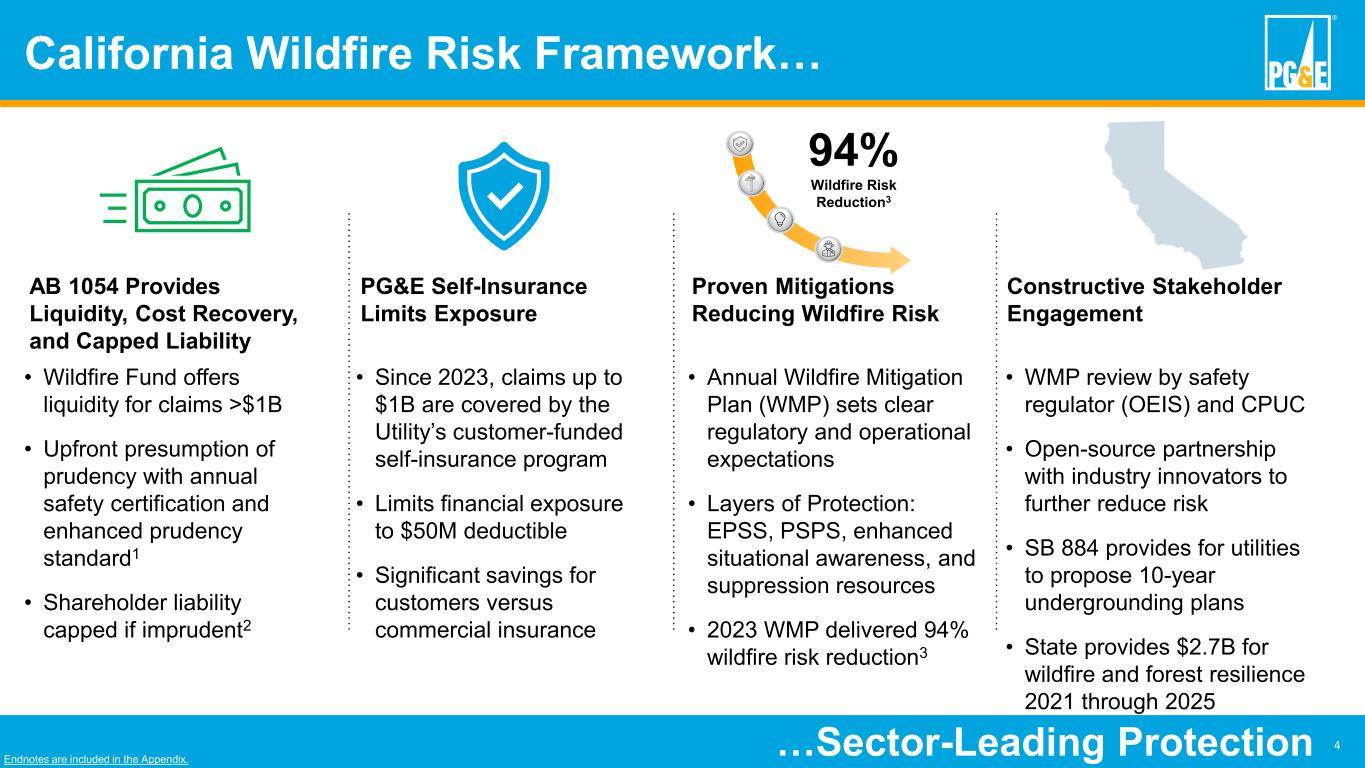 4 Endnotes are included in the Appendix. California Wildfire Risk Framework… …Sector-Leading Protection AB 1054 Provides Liquidity, Cost Recovery, and Capped Liability • Wildfire Fund offers liquidity for claims >$1B • Upfront presumption of prudency with annual safety certification and enhanced prudency standard1 • Shareholder liability capped if imprudent2 Constructive Stakeholder Engagement • WMP review by safety regulator (OEIS) and CPUC • Open-source partnership with industry innovators to further reduce risk • SB 884 provides for utilities to propose 10-year undergrounding plans • State provides $2.7B for wildfire and forest resilience 2021 through 2025 PG&E Self-Insurance Limits Exposure • Since 2023, claims up to $1B are covered by the Utility’s customer-funded self-insurance program • Limits financial exposure to $50M deductible • Significant savings for customers versus commercial insurance Proven Mitigations Reducing Wildfire Risk • Annual Wildfire Mitigation Plan (WMP) sets clear regulatory and operational expectations • Layers of Protection: EPSS, PSPS, enhanced situational awareness, and suppression resources • 2023 WMP delivered 94% wildfire risk reduction3 94% Wildfire Risk Reduction3