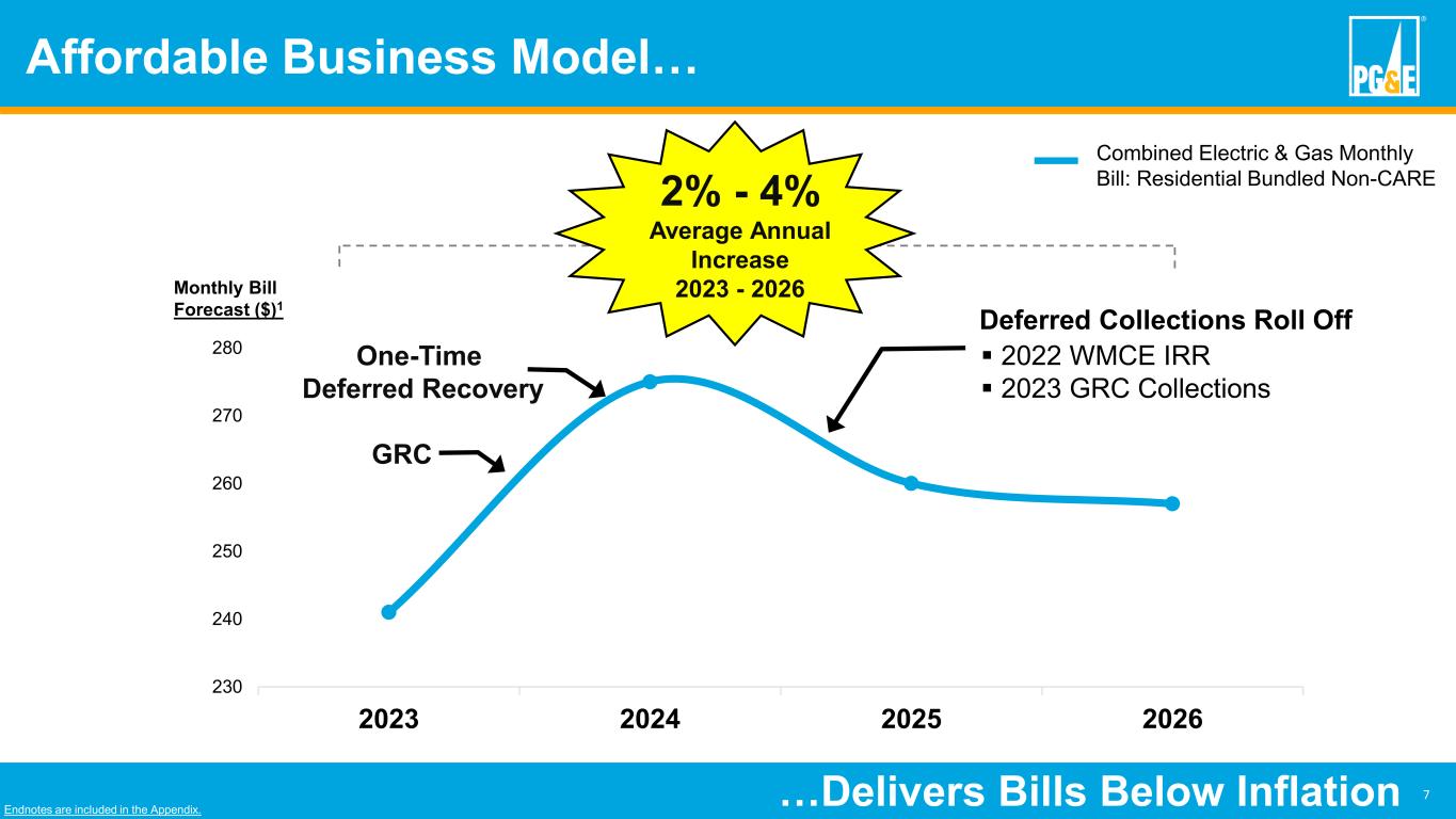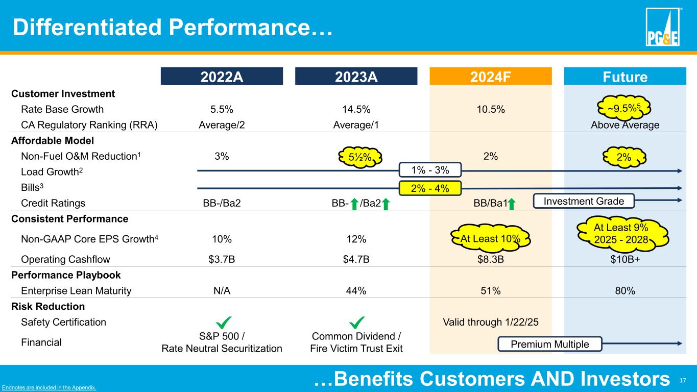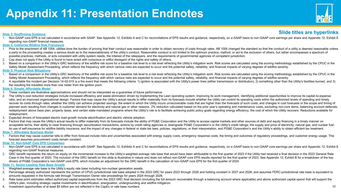 33 Slide titles are hyperlinksSlide 12: Capital Investment For Customers 1. Capital Investment, as presented, is equivalent to Cash from Investment Activities on the Statement of Cash Flows, and as such, includes CapEx, contributions and withdrawals from the customer credit trust, and certain other Balance Sheet items. 2. FFO/Debt is not calculated in accordance with GAAP. Because PG&E Corporation is not able to estimate the impact of specific l ine items, which have the potential to significantly impact the company’s FFO/Debt in future periods, it is not providing a reconciliation for the comparable future period FFO/Debt. Slide 14: Credit Rating Improvements 1. A securities rating is not a recommendation to buy, sell or hold securities and may be subject to revision or withdrawal at any time. 2. Issuer credit rating is the same for each of PG&E Corporation and the Utility. Slide 15: Simple, Affordable Model 1. These numbers are illustrative approximations and should not be interpreted as a guarantee of future performance. 2. The Utility’s cost reduction strategies include increased efficiency and waste elimination driven by implementing the Lean operating system, improving its work management, identifying additional opportunities to improve its capital-to-expense ratio, and an improved organizational design. Factors that may cause the Utility’s actual results to differ materially from i ts forecasts include whether the Utility can control its operating costs within the authorized levels of spending and timely recover its costs through rates; whether the Utility can achieve projected savings; the extent to which the Utility incurs unrecoverable costs that are higher than the forecasts of such costs; and changes in cost forecasts or the scope and timing of planned work resulting from changes in customer demand for electricity and natural gas or other reasons. 2% reduction calculated based on the prior year's operating and maintenance costs, excluding non-core items, balancing account deferrals, redeployment above base plan, property taxes, and certain state-mandated programs where the Utility’s role is to facilitate achieving public policy goals regarding energy efficiency, the cost of which the Utility recovers. Reductions available for redeployment. 3. Expected drivers of forecasted electric load growth include electrification and electric vehicle adoption. 4. Factors that may cause the Utility’s actual results to differ materially from its forecasts include the ability of PG&E Corporation and the Utility to access capital markets and other sources of debt and equity financing in a timely manner on acceptable terms; their ability to raise financing through securitization transactions; actions by credit rating agencies to downgrade PG&E Corporation’s or the Utility’s credit ratings; the supply and price of electricity, natural gas, and nuclear fuel ; its use of self-insurance for wildfire liability insurance; and the impact of any changes in federal or state tax laws, policies , regulations, or their interpretation, and PG&E Corporation’s and the Utility’s ability to obtain efficient tax treatment. 5. Denoted amount is immaterial. 6. A higher discount rate used to measure the projected benefit costs at December 31, 2023 compared to December 31, 2022 resulted in lower pension and other post-retirement benefits service cost in the amount of $321 million. This decrease is embedded in 2023 net cost increases. Slide 17: Differentiated Performance 1. The Utility’s cost reduction strategies include increased efficiency driven by implementing the Lean operating system, improving its work management, identifying additional opportunities to convert expenses to capital expenditures, and an improved organizational design. Factors that may cause the Utility’s actual results to differ materially from its forecasts include whether the Utility can control its operating costs within the authorized levels of spending and timely recover its costs through rates; whether the Utility can achieve projected savings; the extent to which the Utility incurs unrecoverable costs that are higher than the forecasts of such costs; and changes in cost forecasts or the scope and timing of planned work resulting from changes in customer demand for electricity and natural gas or other reasons. 2% reduction calculated based on the prior year's operating and maintenance costs, excluding non-core items, balancing account deferrals, redeployment above base plan, property taxes, and certain state-mandated programs where the Utility’s role is to facilitate achieving public policy goals regarding energy efficiency, the cost of which the Utility recovers. Reductions available for redeployment. 2. Expected drivers of forecasted electric load growth include electrification and electric vehicle adoption. 3. Factors that may cause customer bills to differ from forecast include risks and uncertainties associated with energy supply costs, emergency response costs, the timing and outcomes of regulatory proceedings, and customer energy usage. 4. Non-GAAP core EPS is not calculated in accordance with GAAP. See Appendix 12, Exhibits A and C for reconciliations of EPS results and guidance, respectively, on a GAAP basis to non-GAAP core earnings per share and Appendix 12, Exhibit E regarding non-GAAP financial measures. 5. CAGR is from 2023 through 2028. Appendix 11: Presentation Endnotes