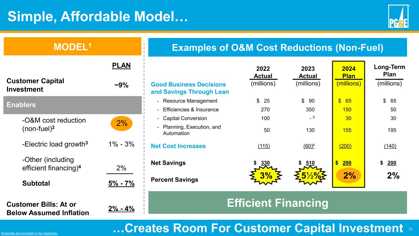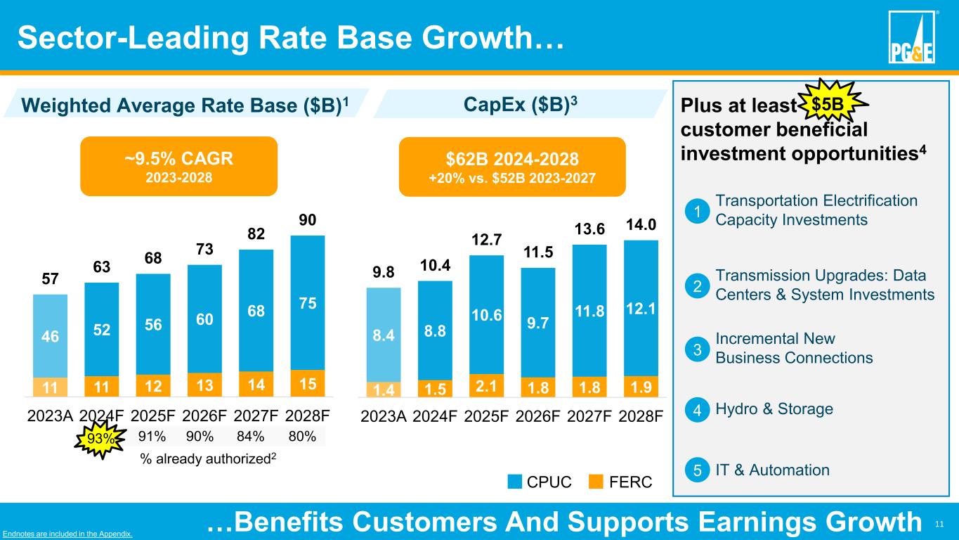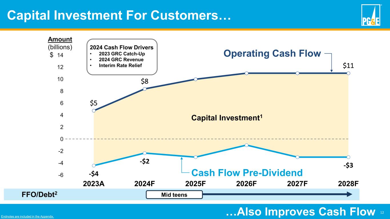 33 Slide titles are hyperlinksSlide 12: Capital Investment For Customers 1. Capital Investment, as presented, is equivalent to Cash from Investment Activities on the Statement of Cash Flows, and as such, includes CapEx, contributions and withdrawals from the customer credit trust, and certain other Balance Sheet items. 2. FFO/Debt is not calculated in accordance with GAAP. Because PG&E Corporation is not able to estimate the impact of specific l ine items, which have the potential to significantly impact the company’s FFO/Debt in future periods, it is not providing a reconciliation for the comparable future period FFO/Debt. Slide 14: Credit Rating Improvements 1. A securities rating is not a recommendation to buy, sell or hold securities and may be subject to revision or withdrawal at any time. 2. Issuer credit rating is the same for each of PG&E Corporation and the Utility. Slide 15: Simple, Affordable Model 1. These numbers are illustrative approximations and should not be interpreted as a guarantee of future performance. 2. The Utility’s cost reduction strategies include increased efficiency and waste elimination driven by implementing the Lean operating system, improving its work management, identifying additional opportunities to improve its capital-to-expense ratio, and an improved organizational design. Factors that may cause the Utility’s actual results to differ materially from i ts forecasts include whether the Utility can control its operating costs within the authorized levels of spending and timely recover its costs through rates; whether the Utility can achieve projected savings; the extent to which the Utility incurs unrecoverable costs that are higher than the forecasts of such costs; and changes in cost forecasts or the scope and timing of planned work resulting from changes in customer demand for electricity and natural gas or other reasons. 2% reduction calculated based on the prior year's operating and maintenance costs, excluding non-core items, balancing account deferrals, redeployment above base plan, property taxes, and certain state-mandated programs where the Utility’s role is to facilitate achieving public policy goals regarding energy efficiency, the cost of which the Utility recovers. Reductions available for redeployment. 3. Expected drivers of forecasted electric load growth include electrification and electric vehicle adoption. 4. Factors that may cause the Utility’s actual results to differ materially from its forecasts include the ability of PG&E Corporation and the Utility to access capital markets and other sources of debt and equity financing in a timely manner on acceptable terms; their ability to raise financing through securitization transactions; actions by credit rating agencies to downgrade PG&E Corporation’s or the Utility’s credit ratings; the supply and price of electricity, natural gas, and nuclear fuel ; its use of self-insurance for wildfire liability insurance; and the impact of any changes in federal or state tax laws, policies , regulations, or their interpretation, and PG&E Corporation’s and the Utility’s ability to obtain efficient tax treatment. 5. Denoted amount is immaterial. 6. A higher discount rate used to measure the projected benefit costs at December 31, 2023 compared to December 31, 2022 resulted in lower pension and other post-retirement benefits service cost in the amount of $321 million. This decrease is embedded in 2023 net cost increases. Slide 17: Differentiated Performance 1. The Utility’s cost reduction strategies include increased efficiency driven by implementing the Lean operating system, improving its work management, identifying additional opportunities to convert expenses to capital expenditures, and an improved organizational design. Factors that may cause the Utility’s actual results to differ materially from its forecasts include whether the Utility can control its operating costs within the authorized levels of spending and timely recover its costs through rates; whether the Utility can achieve projected savings; the extent to which the Utility incurs unrecoverable costs that are higher than the forecasts of such costs; and changes in cost forecasts or the scope and timing of planned work resulting from changes in customer demand for electricity and natural gas or other reasons. 2% reduction calculated based on the prior year's operating and maintenance costs, excluding non-core items, balancing account deferrals, redeployment above base plan, property taxes, and certain state-mandated programs where the Utility’s role is to facilitate achieving public policy goals regarding energy efficiency, the cost of which the Utility recovers. Reductions available for redeployment. 2. Expected drivers of forecasted electric load growth include electrification and electric vehicle adoption. 3. Factors that may cause customer bills to differ from forecast include risks and uncertainties associated with energy supply costs, emergency response costs, the timing and outcomes of regulatory proceedings, and customer energy usage. 4. Non-GAAP core EPS is not calculated in accordance with GAAP. See Appendix 12, Exhibits A and C for reconciliations of EPS results and guidance, respectively, on a GAAP basis to non-GAAP core earnings per share and Appendix 12, Exhibit E regarding non-GAAP financial measures. 5. CAGR is from 2023 through 2028. Appendix 11: Presentation Endnotes