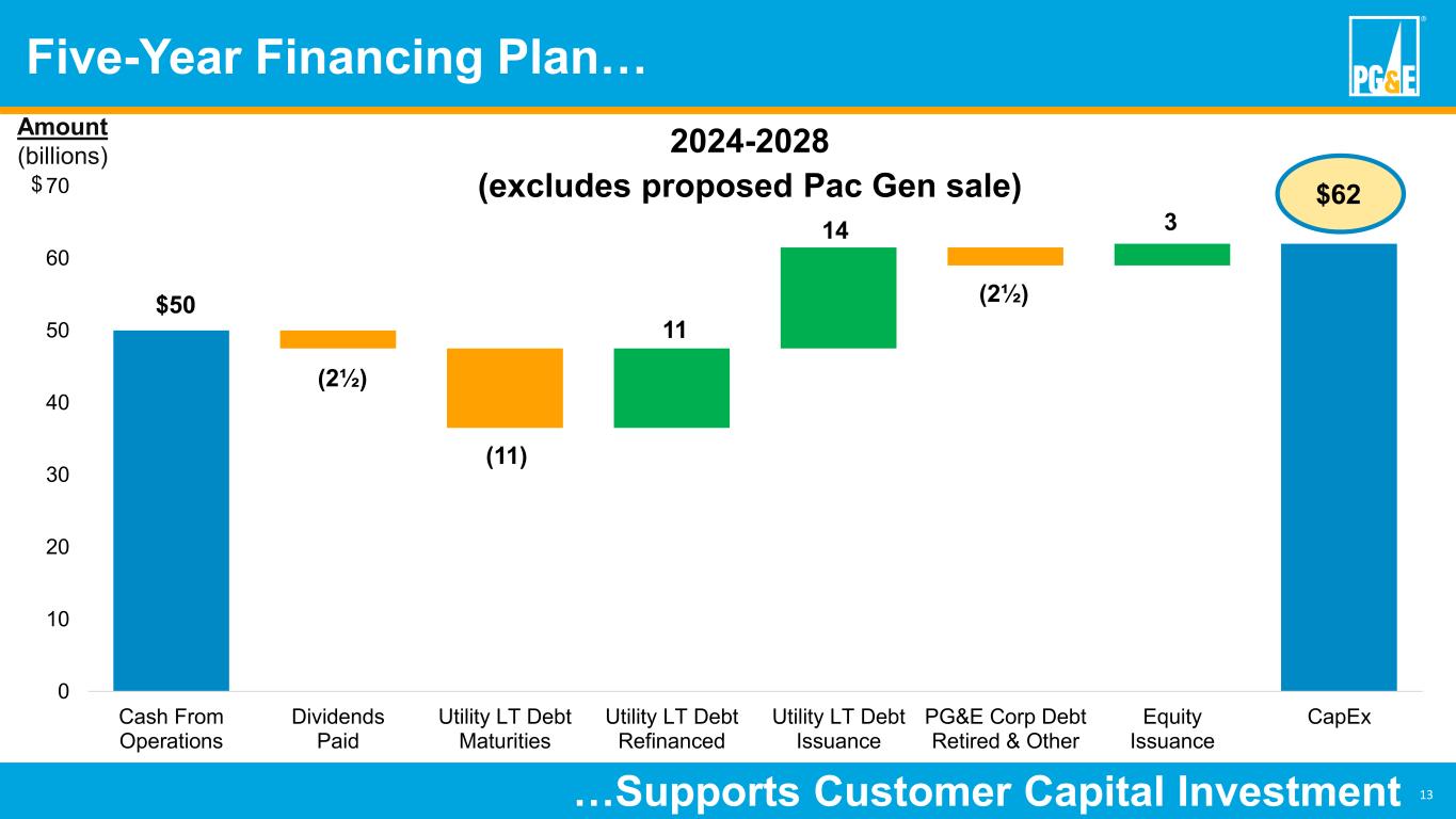 12 Endnotes are included in the Appendix. Capital Investment For Customers… …Also Improves Cash Flow $5 $8 $11 -$4 -$2 -$3 -6 -4 -2 0 2 4 6 8 10 12 14 2023A 2024F 2025F 2026F 2027F 2028F Capital Investment1 Amount (billions) $ Operating Cash Flow Cash Flow Pre-Dividend FFO/Debt2 2024 Cash Flow Drivers • 2023 GRC Catch-Up • 2024 GRC Revenue • Interim Rate Relief Mid teens