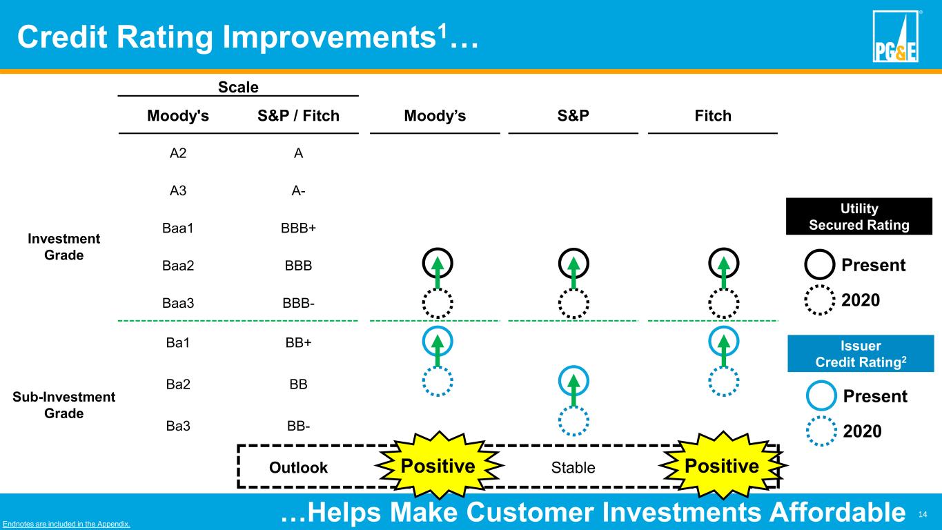 13 Five-Year Financing Plan… …Supports Customer Capital Investment 2024-2028 (excludes proposed Pac Gen sale) $50 $62 (2½) (11) 11 14 (2½) 3 0 10 20 30 40 50 60 70 Cash From Operations Dividends Paid Utility LT Debt Maturities Utility LT Debt Refinanced Utility LT Debt Issuance PG&E Corp Debt Retired & Other Equity Issuance CapEx Amount (billions) $ $62