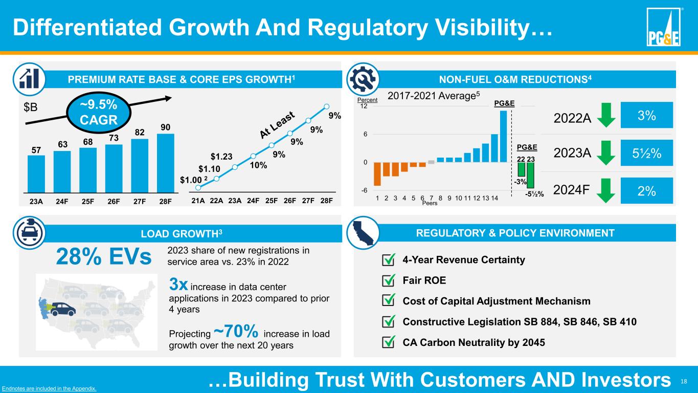 17 Endnotes are included in the Appendix. Differentiated Performance… …Benefits Customers AND Investors 2022A 2023A 2024F Future Customer Investment Rate Base Growth 5.5% 14.5% 10.5% CA Regulatory Ranking (RRA) Average/2 Average/1 Above Average Affordable Model Non-Fuel O&M Reduction1 3% 2% Load Growth2 Bills3 Credit Ratings BB-/Ba2 BB- /Ba2 BB/Ba1 Consistent Performance Non-GAAP Core EPS Growth4 10% 12% Operating Cashflow $3.7B $4.7B $8.3B $10B+ Performance Playbook Enterprise Lean Maturity N/A 44% 51% 80% Risk Reduction Safety Certification Valid through 1/22/25 Financial S&P 500 / Rate Neutral Securitization Common Dividend / Fire Victim Trust Exit 2% - 4% Premium Multiple 1 - 3 2% - 4% Investment Grade Premium Multiple 5½% 2% At Least 10% At Least 9% 2025 - 2028