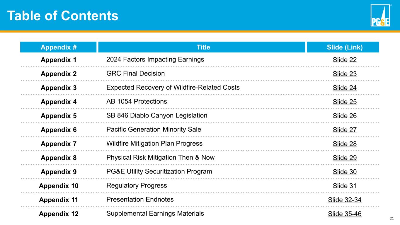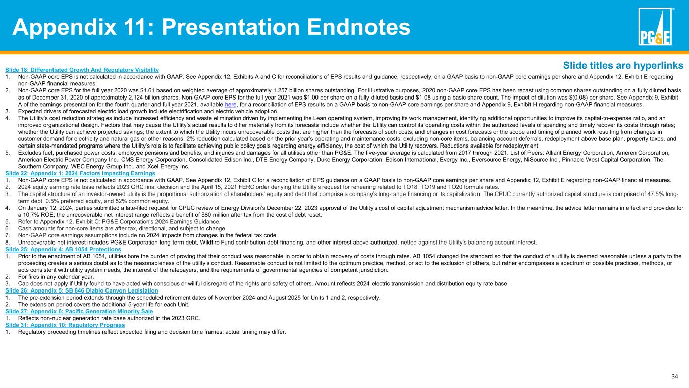 34 Slide titles are hyperlinks Appendix 11: Presentation Endnotes Slide 18: Differentiated Growth And Regulatory Visibility 1. Non-GAAP core EPS is not calculated in accordance with GAAP. See Appendix 12, Exhibits A and C for reconciliations of EPS results and guidance, respectively, on a GAAP basis to non-GAAP core earnings per share and Appendix 12, Exhibit E regarding non-GAAP financial measures. 2. Non-GAAP core EPS for the full year 2020 was $1.61 based on weighted average of approximately 1.257 billion shares outstanding. For illustrative purposes, 2020 non-GAAP core EPS has been recast using common shares outstanding on a fully diluted basis as of December 31, 2020 of approximately 2.124 billion shares. Non-GAAP core EPS for the full year 2021 was $1.00 per share on a fully diluted basis and $1.08 using a basic share count. The impact of dilution was $(0.08) per share. See Appendix 9, Exhibit A of the earnings presentation for the fourth quarter and full year 2021, available here, for a reconciliation of EPS results on a GAAP basis to non-GAAP core earnings per share and Appendix 9, Exhibit H regarding non-GAAP financial measures. 3. Expected drivers of forecasted electric load growth include electrification and electric vehicle adoption. 4. The Utility’s cost reduction strategies include increased efficiency and waste elimination driven by implementing the Lean operating system, improving its work management, identifying additional opportunities to improve its capital-to-expense ratio, and an improved organizational design. Factors that may cause the Utility’s actual results to differ materially from its forecasts include whether the Utility can control its operating costs within the authorized levels of spending and timely recover its costs through rates; whether the Utility can achieve projected savings; the extent to which the Utility incurs unrecoverable costs that are higher than the forecasts of such costs; and changes in cost forecasts or the scope and timing of planned work resulting from changes in customer demand for electricity and natural gas or other reasons. 2% reduction calculated based on the prior year’s operating and maintenance costs, excluding non-core items, balancing account deferrals, redeployment above base plan, property taxes, and certain state-mandated programs where the Utility’s role is to facilitate achieving public policy goals regarding energy efficiency, the cost of which the Utility recovers. Reductions available for redeployment. 5. Excludes fuel, purchased power costs, employee pensions and benefits, and injuries and damages for all utilities other than PG&E. The five-year average is calculated from 2017 through 2021. List of Peers: Alliant Energy Corporation, Ameren Corporation, American Electric Power Company Inc., CMS Energy Corporation, Consolidated Edison Inc., DTE Energy Company, Duke Energy Corporation, Edison International, Evergy Inc., Eversource Energy, NiSource Inc., Pinnacle West Capital Corporation, The Southern Company, WEC Energy Group Inc., and Xcel Energy Inc. Slide 22: Appendix 1: 2024 Factors Impacting Earnings 1. Non-GAAP core EPS is not calculated in accordance with GAAP. See Appendix 12, Exhibit C for a reconciliation of EPS guidance on a GAAP basis to non-GAAP core earnings per share and Appendix 12, Exhibit E regarding non-GAAP financial measures. 2. 2024 equity earning rate base reflects 2023 GRC final decision and the April 15, 2021 FERC order denying the Utility's request for rehearing related to TO18, TO19 and TO20 formula rates. 3. The capital structure of an investor-owned utility is the proportional authorization of shareholders’ equity and debt that comprise a company’s long-range financing or its capitalization. The CPUC currently authorized capital structure is comprised of 47.5% long- term debt, 0.5% preferred equity, and 52% common equity. 4. On January 12, 2024, parties submitted a late-filed request for CPUC review of Energy Division’s December 22, 2023 approval of the Utility's cost of capital adjustment mechanism advice letter. In the meantime, the advice letter remains in effect and provides for a 10.7% ROE; the unrecoverable net interest range reflects a benefit of $80 million after tax from the cost of debt reset. 5. Refer to Appendix 12, Exhibit C: PG&E Corporation's 2024 Earnings Guidance. 6. Cash amounts for non-core items are after tax, directional, and subject to change. 7. Non-GAAP core earnings assumptions include no 2024 impacts from changes in the federal tax code 8. Unrecoverable net interest includes PG&E Corporation long-term debt, Wildfire Fund contribution debt financing, and other interest above authorized, netted against the Utility’s balancing account interest. Slide 25: Appendix 4: AB 1054 Protections 1. Prior to the enactment of AB 1054, utilities bore the burden of proving that their conduct was reasonable in order to obtain recovery of costs through rates. AB 1054 changed the standard so that the conduct of a utility is deemed reasonable unless a party to the proceeding creates a serious doubt as to the reasonableness of the utility’s conduct. Reasonable conduct is not limited to the optimum practice, method, or act to the exclusion of others, but rather encompasses a spectrum of possible practices, methods, or acts consistent with utility system needs, the interest of the ratepayers, and the requirements of governmental agencies of competent jurisdiction. 2. For fires in any calendar year. 3. Cap does not apply if Utility found to have acted with conscious or willful disregard of the rights and safety of others. Amount reflects 2024 electric transmission and distribution equity rate base. Slide 26: Appendix 5: SB 846 Diablo Canyon Legislation 1. The pre-extension period extends through the scheduled retirement dates of November 2024 and August 2025 for Units 1 and 2, respectively. 2. The extension period covers the additional 5-year life for each Unit. Slide 27: 