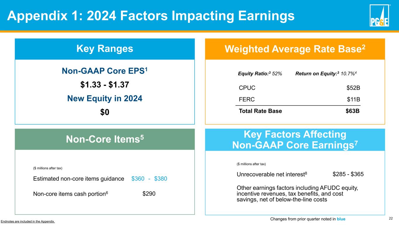 21 Table of Contents Appendix # Title Slide (Link) Appendix 1 2024 Factors Impacting Earnings Slide 22 Appendix 2 GRC Final Decision Slide 23 Appendix 3 Expected Recovery of Wildfire-Related Costs Slide 24 Appendix 4 AB 1054 Protections Slide 25 Appendix 5 SB 846 Diablo Canyon Legislation Slide 26 Appendix 6 Pacific Generation Minority Sale Slide 27 Appendix 7 Wildfire Mitigation Plan Progress Slide 28 Appendix 8 Physical Risk Mitigation Then & Now Slide 29 Appendix 9 PG&E Utility Securitization Program Slide 30 Appendix 10 Regulatory Progress Slide 31 Appendix 11 Presentation Endnotes Slide 32-34 Appendix 12 Supplemental Earnings Materials Slide 35-46