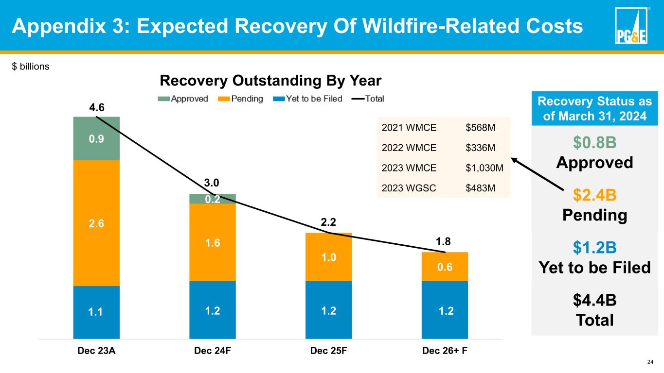 23 Appendix 2: GRC Final Decision 2023 2024 2025 2026 $13.52 $14.24 $14.60 $14.80 Revenue Catch-Up • Cash collection of 2023 incremental revenue requirement • Softens 2024 rates and lowers bills in 2026 Escalation • Increases reflecting incremental inflation in 2021 and 2022 Undergrounding • Adopts over 60% of requested 2023-2026 miles • Permanent wildfire risk reduction Wildfire Mitigation • Funds critical wildfire risk mitigation programs Authorized Miles EPSS & PSPS Month Amortization Funds 163 miles per year for gas distribution pipe replacement Fully funds requested annual energization work Revenue Requirement $B IMPROVED 36 24 25% 50% IMPROVED IMPROVED 973 1,230 RESTORED