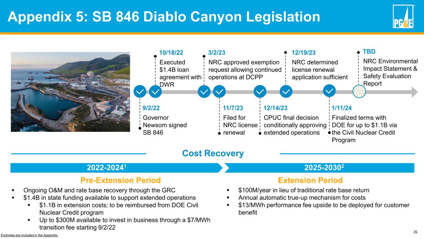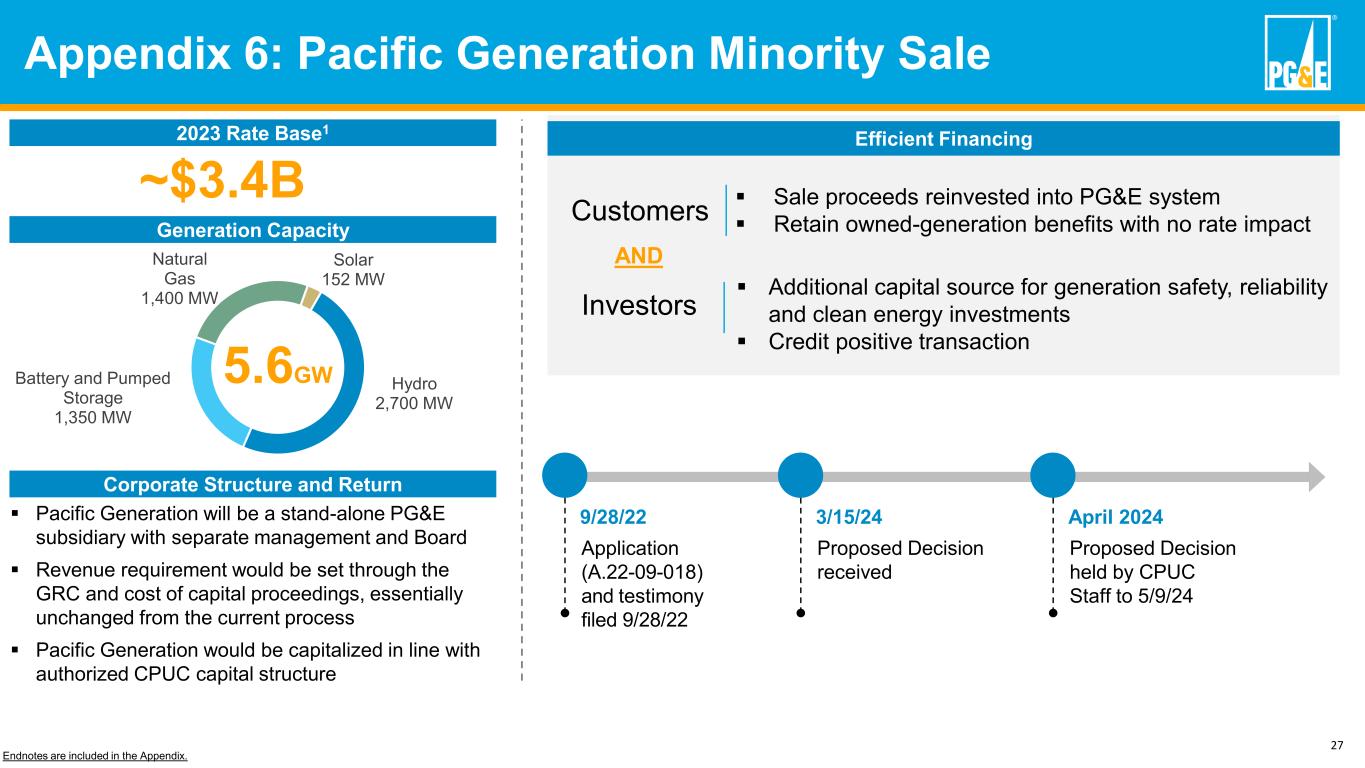 26 Endnotes are included in the Appendix. Cost Recovery 2022-20241 2025-20302 ▪ Ongoing O&M and rate base recovery through the GRC ▪ $1.4B in state funding available to support extended operations ▪ $1.1B in extension costs; to be reimbursed from DOE Civil Nuclear Credit program ▪ Up to $300M available to invest in business through a $7/MWh transition fee starting 9/2/22 ▪ $100M/year in lieu of traditional rate base return ▪ Annual automatic true-up mechanism for costs ▪ $13/MWh performance fee upside to be deployed for customer benefit Pre-Extension Period Extension Period Appendix 5: SB 846 Diablo Canyon Legislation 9/2/22 Governor Newsom signed SB 846 1/11/24 Finalized terms with DOE for up to $1.1B via the Civil Nuclear Credit Program 10/18/22 Executed $1.4B loan agreement with DWR 3/2/23 NRC approved exemption request allowing continued operations at DCPP 11/7/23 Filed for NRC license renewal 12/14/23 CPUC final decision conditionally approving extended operations 12/19/23 NRC determined license renewal application sufficient TBD NRC Environmental Impact Statement & Safety Evaluation Report