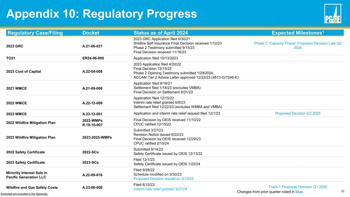 31 Endnotes are included in the Appendix. Changes from prior quarter noted in blue Regulatory Case/Filing Docket Status as of April 2024 Expected Milestones1 2023 GRC A.21-06-021 2023 GRC Application filed 6/30/21 Wildfire Self-Insurance Final Decision received 1/12/23 Phase 2 Testimony submitted 9/15/23 Final Decision received 11/16/23 Phase 2 “Capacity Phase” Proposed Decision Late Q2 2024 TO21 ER24-96-000 Application filed 10/13/2023 2023 Cost of Capital A.22-04-008 2023 Application filed 4/20/22 Final Decision 12/15/22 Phase 2 Opening Testimony submitted 1/29/2024. ACCAM Tier 2 Advice Letter approved 12/22/23 (4813-G/7046-E) 2021 WMCE A.21-09-008 Application filed 9/16/21 Settlement filed 1/18/23 (excludes VMBA) Final Decision on Settlement 8/31/23 2022 WMCE A.22-12-009 Application filed 12/15/22 Interim rate relief granted 6/8/23 Settlement filed 12/22/23 (excludes WMBA and VMBA) 2023 WMCE A.23-12-001 Application and interim rate relief request filed 12/1/23 Proposed Decision Q2 2025 2022 Wildfire Mitigation Plan 2022-WMPs R.18-10-007 Final Decision by OEIS received 11/10/22 CPUC ratified 12/15/22 2023 Wildfire Mitigation Plan 2023-2025-WMPs Submitted 3/27/23 Revision Notice issued 6/22/23 Final Decision by OEIS received 12/29/23 CPUC ratified 2/15/24 2022 Safety Certificate 2022-SCs Submitted 9/14/22 Safety Certificate issued by OEIS 12/13/22 2023 Safety Certificate 2023-SCs Filed 12/1/23 Safety Certificate issued by OEIS 1/22/24 Minority Interest Sale in Pacific Generation LLC A.22-09-018 Filed 9/28/22 Schedule modified on 3/30/23 Proposed Decision issued on 3/15/24 Wildfire and Gas Safety Costs A.23-06-008 Filed 6/15/23 Interim rate relief granted 3/27/24 Track 1 Proposed Decision Q1 2025 Appendix 10: Regulatory Progress