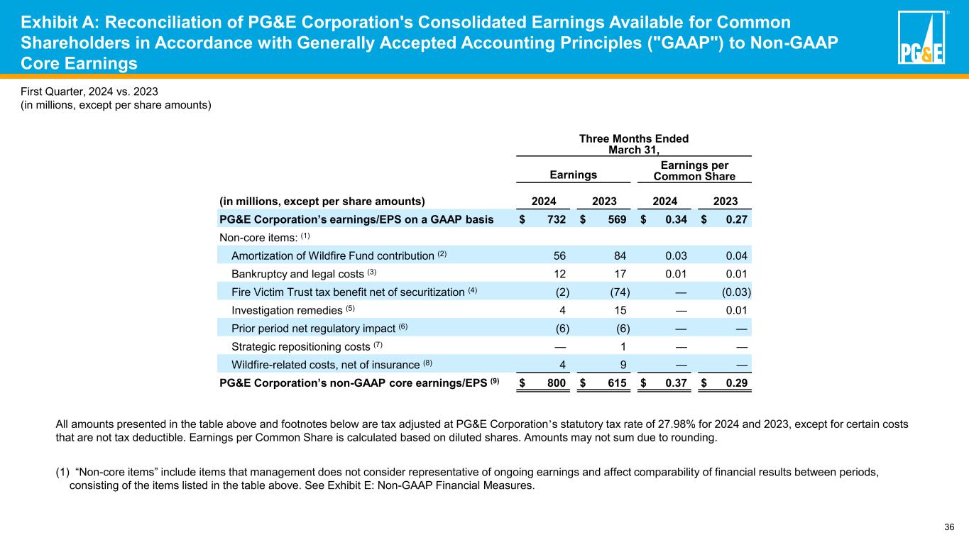 36 Exhibit A: Reconciliation of PG&E Corporation's Consolidated Earnings Available for Common Shareholders in Accordance with Generally Accepted Accounting Principles ("GAAP") to Non-GAAP Core Earnings Three Months Ended March 31, Earnings Earnings per Common Share (in millions, except per share amounts) 2024 2023 2024 2023 PG&E Corporation’s earnings/EPS on a GAAP basis $ 732 $ 569 $ 0.34 $ 0.27 Non-core items: (1) Amortization of Wildfire Fund contribution (2) 56 84 0.03 0.04 Bankruptcy and legal costs (3) 12 17 0.01 0.01 Fire Victim Trust tax benefit net of securitization (4) (2) (74) — (0.03) Investigation remedies (5) 4 15 — 0.01 Prior period net regulatory impact (6) (6) (6) — — Strategic repositioning costs (7) — 1 — — Wildfire-related costs, net of insurance (8) 4 9 — — PG&E Corporation’s non-GAAP core earnings/EPS (9) $ 800 $ 615 $ 0.37 $ 0.29 All amounts presented in the table above and footnotes below are tax adjusted at PG&E Corporation’s statutory tax rate of 27.98% for 2024 and 2023, except for certain costs that are not tax deductible. Earnings per Common Share is calculated based on diluted shares. Amounts may not sum due to rounding. First Quarter, 2024 vs. 2023 (in millions, except per share amounts) (1) “Non-core items” include items that management does not consider representative of ongoing earnings and affect comparability of financial results between periods, consisting of the items listed in the table above. See Exhibit E: Non-GAAP Financial Measures.