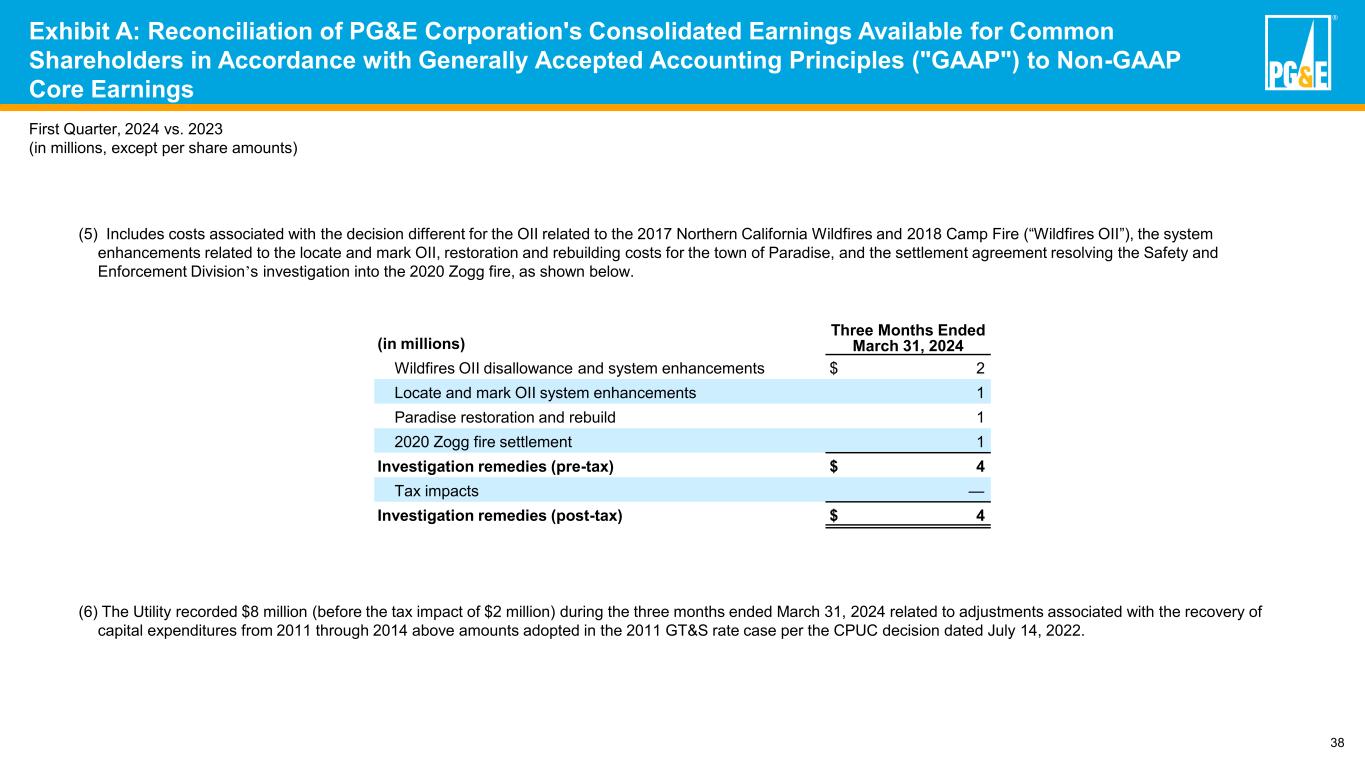 37 First Quarter, 2024 vs. 2023 (in millions, except per share amounts) (3) PG&E Corporation and the Utility recorded costs of $17 million (before the tax impact of $5 million) during the three months ended March 31, 2024 related to bankruptcy and legal costs associated with PG&E Corporation’s and the Utility’s Chapter 11 filing, including legal and other costs. (2) The Utility recorded costs of $78 million (before the tax impact of $22 million) during the three months ended March 31, 2024, associated with the amortization of the Wildfire Fund asset and accretion of the related Wildfire Fund liability. Exhibit A: Reconciliation of PG&E Corporation's Consolidated Earnings Available for Common Shareholders in Accordance with Generally Accepted Accounting Principles ("GAAP") to Non-GAAP Core Earnings (4) The Utility recorded a net gain of $3 million (before the tax impact of $1 million) during the three months ended March 31, 2024 related to any earnings-impacting investment losses or gains associated with investments related to the contributions to the customer credit trust. Previously included the charge related to the establishment of the SB901 securitization regulatory asset and the SB901 securitization regulatory liability associated with revenue credits funded by the net operating loss monetization and tax benefits related to the Fire Victim's Trust's sale of PG&E corporation common stock.