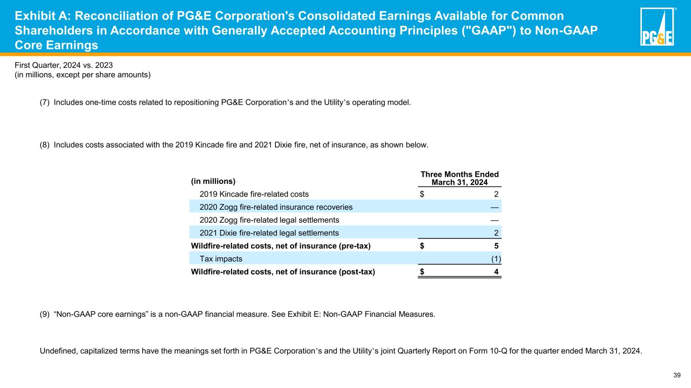 38 First Quarter, 2024 vs. 2023 (in millions, except per share amounts) (in millions) Three Months Ended March 31, 2024 Wildfires OII disallowance and system enhancements $ 2 Locate and mark OII system enhancements 1 Paradise restoration and rebuild 1 2020 Zogg fire settlement 1 Investigation remedies (pre-tax) $ 4 Tax impacts — Investigation remedies (post-tax) $ 4 (5) Includes costs associated with the decision different for the OII related to the 2017 Northern California Wildfires and 2018 Camp Fire (“Wildfires OII”), the system enhancements related to the locate and mark OII, restoration and rebuilding costs for the town of Paradise, and the settlement agreement resolving the Safety and Enforcement Division’s investigation into the 2020 Zogg fire, as shown below. Exhibit A: Reconciliation of PG&E Corporation's Consolidated Earnings Available for Common Shareholders in Accordance with Generally Accepted Accounting Principles ("GAAP") to Non-GAAP Core Earnings (6) The Utility recorded $8 million (before the tax impact of $2 million) during the three months ended March 31, 2024 related to adjustments associated with the recovery of capital expenditures from 2011 through 2014 above amounts adopted in the 2011 GT&S rate case per the CPUC decision dated July 14, 2022.