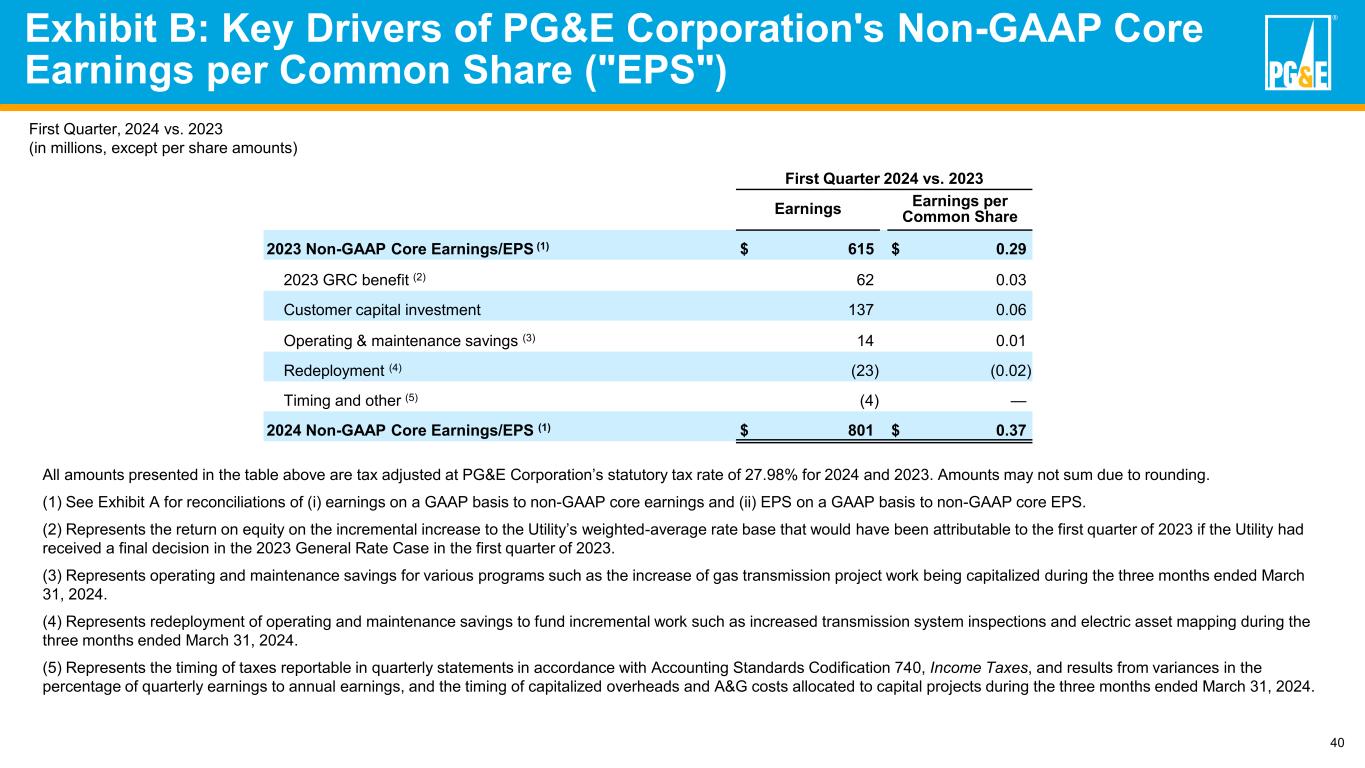 40 All amounts presented in the table above are tax adjusted at PG&E Corporation’s statutory tax rate of 27.98% for 2024 and 2023. Amounts may not sum due to rounding. (1) See Exhibit A for reconciliations of (i) earnings on a GAAP basis to non-GAAP core earnings and (ii) EPS on a GAAP basis to non-GAAP core EPS. (2) Represents the return on equity on the incremental increase to the Utility’s weighted-average rate base that would have been attributable to the first quarter of 2023 if the Utility had received a final decision in the 2023 General Rate Case in the first quarter of 2023. (3) Represents operating and maintenance savings for various programs such as the increase of gas transmission project work being capitalized during the three months ended March 31, 2024. (4) Represents redeployment of operating and maintenance savings to fund incremental work such as increased transmission system inspections and electric asset mapping during the three months ended March 31, 2024. (5) Represents the timing of taxes reportable in quarterly statements in accordance with Accounting Standards Codification 740, Income Taxes, and results from variances in the percentage of quarterly earnings to annual earnings, and the timing of capitalized overheads and A&G costs allocated to capital projects during the three months ended March 31, 2024. First Quarter 2024 vs. 2023 Earnings Earnings per Common Share 2023 Non-GAAP Core Earnings/EPS (1) $ 615 $ 0.29 2023 GRC benefit (2) 62 0.03 Customer capital investment 137 0.06 Operating & maintenance savings (3) 14 0.01 Redeployment (4) (23) (0.02) Timing and other (5) (4) — 2024 Non-GAAP Core Earnings/EPS (1) $ 801 $ 0.37 First Quarter, 2024 vs. 2023 (in millions, except per share amounts) Exhibit B: Key Drivers of PG&E Corporation's Non-GAAP Core Earnings per Common Share ("EPS")