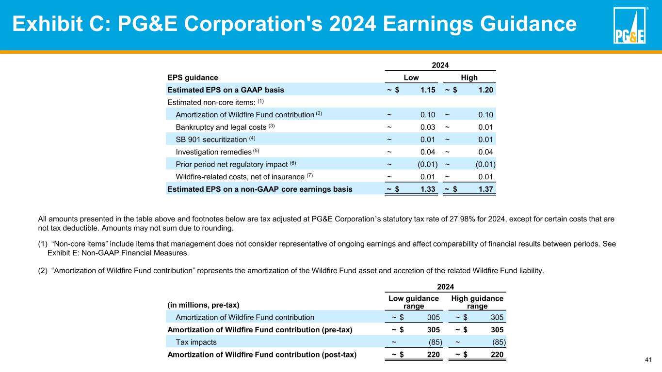 41 2024 EPS guidance Low High Estimated EPS on a GAAP basis ~ $ 1.15 ~ $ 1.20 Estimated non-core items: (1) Amortization of Wildfire Fund contribution (2) ~ 0.10 ~ 0.10 Bankruptcy and legal costs (3) ~ 0.03 ~ 0.01 SB 901 securitization (4) ~ 0.01 ~ 0.01 Investigation remedies (5) ~ 0.04 ~ 0.04 Prior period net regulatory impact (6) ~ (0.01) ~ (0.01) Wildfire-related costs, net of insurance (7) ~ 0.01 ~ 0.01 Estimated EPS on a non-GAAP core earnings basis ~ $ 1.33 ~ $ 1.37 All amounts presented in the table above and footnotes below are tax adjusted at PG&E Corporation’s statutory tax rate of 27.98% for 2024, except for certain costs that are not tax deductible. Amounts may not sum due to rounding. (1) “Non-core items” include items that management does not consider representative of ongoing earnings and affect comparability of financial results between periods. See Exhibit E: Non-GAAP Financial Measures. 2024 (in millions, pre-tax) Low guidance range High guidance range Amortization of Wildfire Fund contribution ~ $ 305 ~ $ 305 Amortization of Wildfire Fund contribution (pre-tax) ~ $ 305 ~ $ 305 Tax impacts ~ (85) ~ (85) Amortization of Wildfire Fund contribution (post-tax) ~ $ 220 ~ $ 220 (2) “Amortization of Wildfire Fund contribution” represents the amortization of the Wildfire Fund asset and accretion of the related Wildfire Fund liability. Exhibit C: PG&E Corporation's 2024 Earnings Guidance