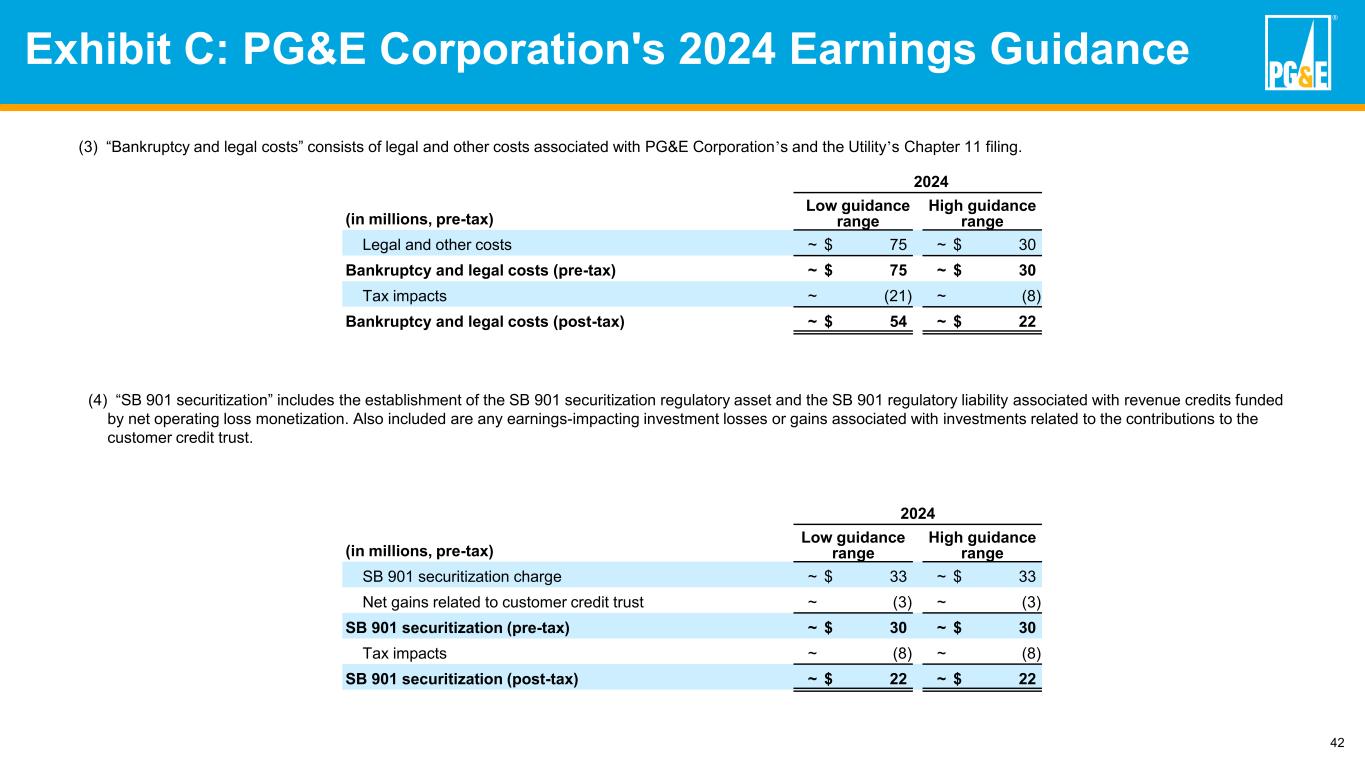 42 Exhibit E: PG&E Corporation's 2020 and 2021 Earnings Guidance (4) “SB 901 securitization” includes the establishment of the SB 901 securitization regulatory asset and the SB 901 regulatory liability associated with revenue credits funded by net operating loss monetization. Also included are any earnings-impacting investment losses or gains associated with investments related to the contributions to the customer credit trust. (3) “Bankruptcy and legal costs” consists of legal and other costs associated with PG&E Corporation’s and the Utility’s Chapter 11 filing. 2024 (in millions, pre-tax) Low guidance range High guidance range Legal and other costs ~ $ 75 ~ $ 30 Bankruptcy and legal costs (pre-tax) ~ $ 75 ~ $ 30 Tax impacts ~ (21) ~ (8) Bankruptcy and legal costs (post-tax) ~ $ 54 ~ $ 22 2024 (in millions, pre-tax) Low guidance range High guidance range SB 901 securitization charge ~ $ 33 ~ $ 33 Net gains related to customer credit trust ~ (3) ~ (3) SB 901 securitization (pre-tax) ~ $ 30 ~ $ 30 Tax impacts ~ (8) ~ (8) SB 901 securitization (post-tax) ~ $ 22 ~ $ 22 Exhibit C: PG&E Corporation's 2024 Earnings Guidance