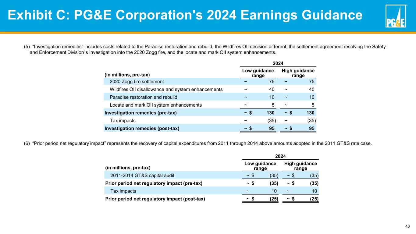 43 (6) “Prior period net regulatory impact” represents the recovery of capital expenditures from 2011 through 2014 above amounts adopted in the 2011 GT&S rate case. (5) “Investigation remedies” includes costs related to the Paradise restoration and rebuild, the Wildfires OII decision different, the settlement agreement resolving the Safety and Enforcement Division’s investigation into the 2020 Zogg fire, and the locate and mark OII system enhancements. 2024 (in millions, pre-tax) Low guidance range High guidance range 2020 Zogg fire settlement ~ 75 ~ 75 Wildfires OII disallowance and system enhancements ~ 40 ~ 40 Paradise restoration and rebuild ~ 10 ~ 10 Locate and mark OII system enhancements ~ 5 ~ 5 Investigation remedies (pre-tax) ~ $ 130 ~ $ 130 Tax impacts ~ (35) ~ (35) Investigation remedies (post-tax) ~ $ 95 ~ $ 95 2024 (in millions, pre-tax) Low guidance range High guidance range 2011-2014 GT&S capital audit ~ $ (35) ~ $ (35) Prior period net regulatory impact (pre-tax) ~ $ (35) ~ $ (35) Tax impacts ~ 10 ~ 10 Prior period net regulatory impact (post-tax) ~ $ (25) ~ $ (25) Exhibit C: PG&E Corporation's 2024 Earnings Guidance