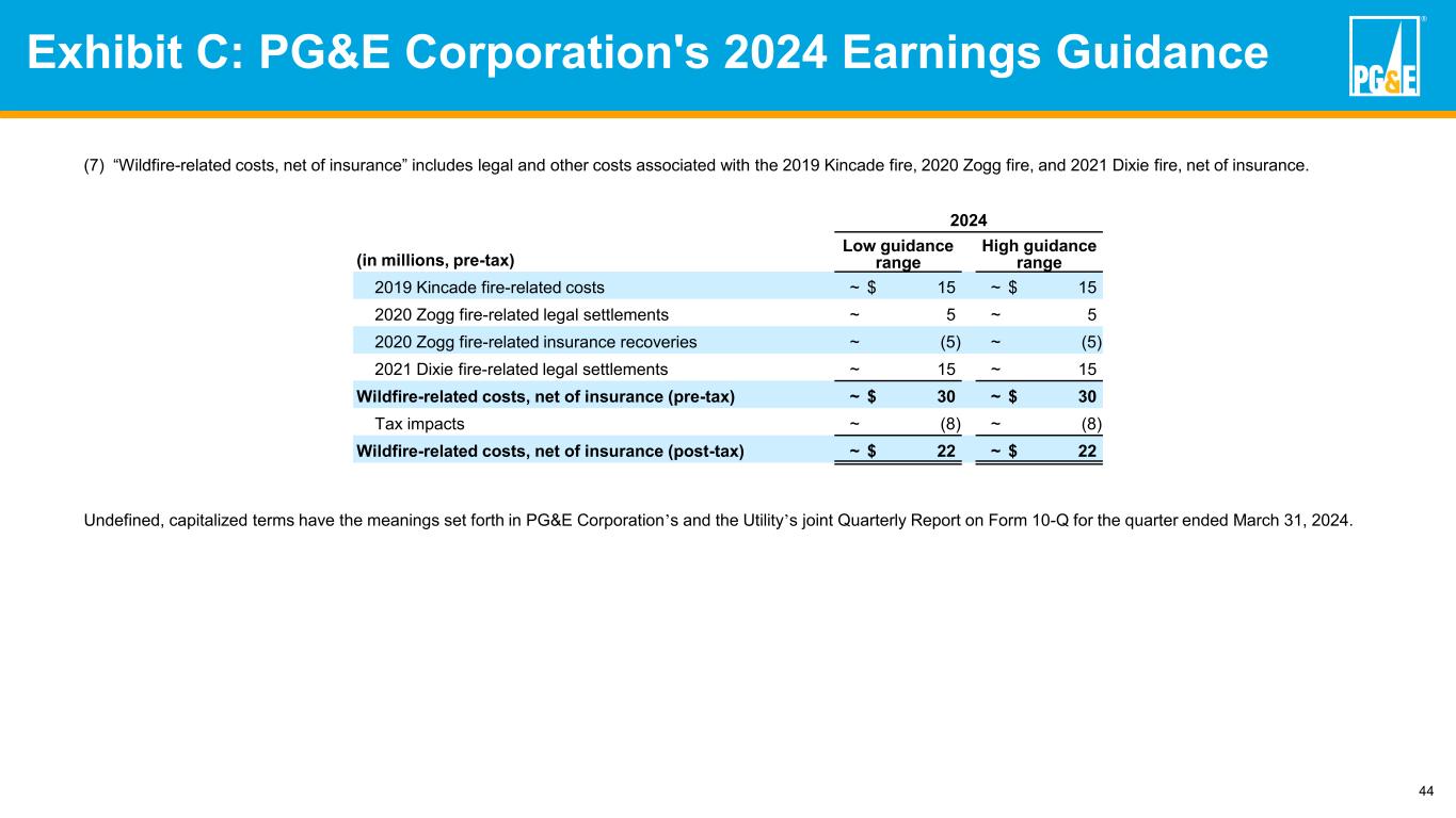 44 Undefined, capitalized terms have the meanings set forth in PG&E Corporation’s and the Utility’s joint Quarterly Report on Form 10-Q for the quarter ended March 31, 2024. (7) “Wildfire-related costs, net of insurance” includes legal and other costs associated with the 2019 Kincade fire, 2020 Zogg fire, and 2021 Dixie fire, net of insurance. 2024 (in millions, pre-tax) Low guidance range High guidance range 2019 Kincade fire-related costs ~ $ 15 ~ $ 15 2020 Zogg fire-related legal settlements ~ 5 ~ 5 2020 Zogg fire-related insurance recoveries ~ (5) ~ (5) 2021 Dixie fire-related legal settlements ~ 15 ~ 15 Wildfire-related costs, net of insurance (pre-tax) ~ $ 30 ~ $ 30 Tax impacts ~ (8) ~ (8) Wildfire-related costs, net of insurance (post-tax) ~ $ 22 ~ $ 22 Exhibit C: PG&E Corporation's 2024 Earnings Guidance