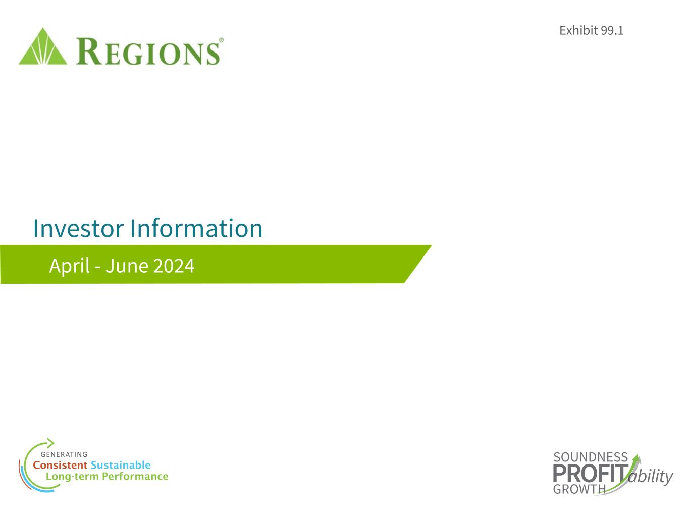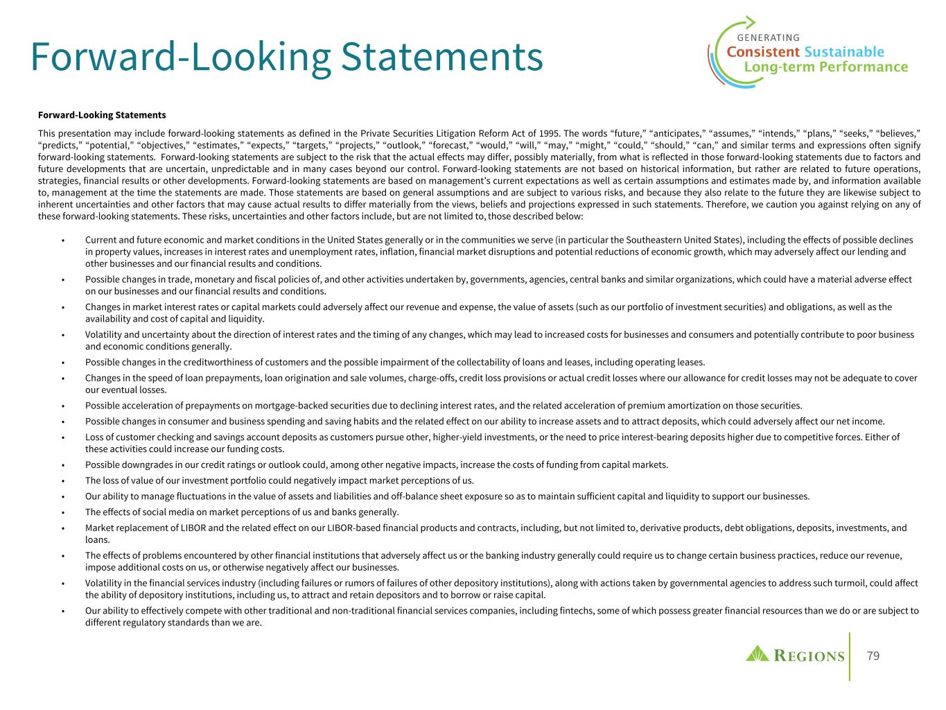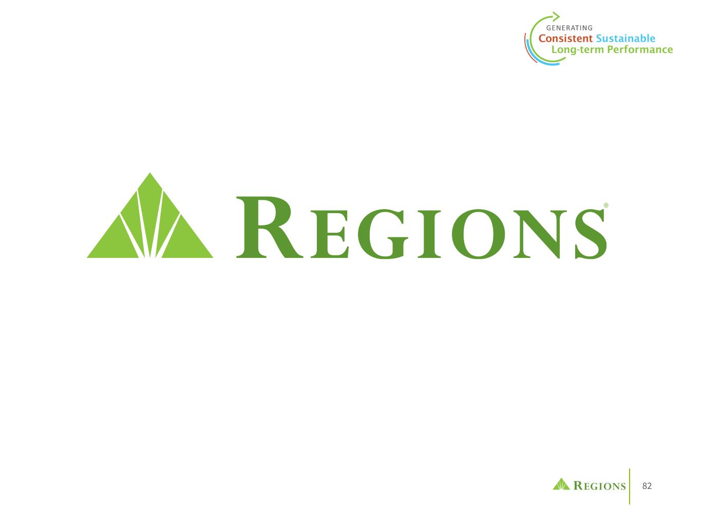 81 • Our ability to comply with stress testing and capital planning requirements (as part of the CCAR process or otherwise) may continue to require a significant investment of our managerial resources due to the importance of such tests and requirements. • Our ability to comply with applicable capital and liquidity requirements (including, among other things, the Basel III capital standards), including our ability to generate capital internally or raise capital on favorable terms, and if we fail to meet requirements, our financial condition and market perceptions of us could be negatively impacted. • Our ability to recruit and retain talented and experienced personnel to assist in the development, management and operation of our products and services may be affected by changes in laws and regulations in effect from time to time. • Our ability to receive dividends from our subsidiaries, in particular Regions Bank, could affect our liquidity and ability to pay dividends to shareholders. • Fluctuations in the price of our common stock and inability to complete stock repurchases in the time frame and/or on the terms anticipated. • The effects of anti-takeover laws and exclusive forum provision in our certificate of incorporation and bylaws. • The effect of new tax legislation and/or interpretation of existing tax law, which may impact our earnings, capital ratios and our ability to return capital to shareholders. • Changes in accounting policies or procedures as may be required by the FASB or other regulatory agencies could materially affect our financial statements and how we report those results, and expectations and preliminary analyses relating to how such changes will affect our financial results could prove incorrect. • Any impairment of our goodwill or other intangibles, any repricing of assets or any adjustment of valuation allowances on our deferred tax assets due to changes in tax law, adverse changes in the economic environment declining operations of the reporting unit or other factors. • The effects of man-made and natural disasters, including fires, floods, droughts, tornadoes, hurricanes and environmental damage (especially in the Southeastern United States), which may negatively affect our operations and/or our loan portfolios and increase our cost of conducting business. The severity and frequency of future earthquakes, fires, hurricanes, tornadoes, droughts, floods and other weather-related events are difficult to predict and may be exacerbated by global climate change. • The impact of pandemics on our businesses, operations and financial results and conditions. The duration and severity of any pandemic as well as government actions or other restrictions in connection with such events could disrupt the global economy, adversely affect our capital and liquidity position, impair the ability of borrowers to repay outstanding loans and increase our allowance for credit losses, impair collateral values and result in lost revenue or additional expenses. • The effects of any damage to our reputation resulting from developments related to any of the items identified above. • Other risks identified from time to time in reports that we file with the SEC. The foregoing list of factors is not exhaustive. For discussion of these and other factors that may cause actual results to differ from expectations, look under the captions “Forward-Looking Statements” and “Risk Factors” in Regions’ Annual Report on Form 10-K for the year ended December 31, 2023 and in Regions’ subsequent filings with the SEC. You should not place undue reliance on any forward-looking statements, which speak only as of the date made. Factors or events that could cause our actual results to differ may emerge from time to time, and it is not possible to predict all of them. We assume no obligation and do not intend to update or revise any forward-looking statements that are made from time to time, either as a result of future developments, new information or otherwise, except as may be required by law. Regions’ Investor Relations contact is Dana Nolan at (205) 264-7040; Regions’ Media contact is Jeremy King at (205) 264-4551. Forward-Looking Statements (continued)
