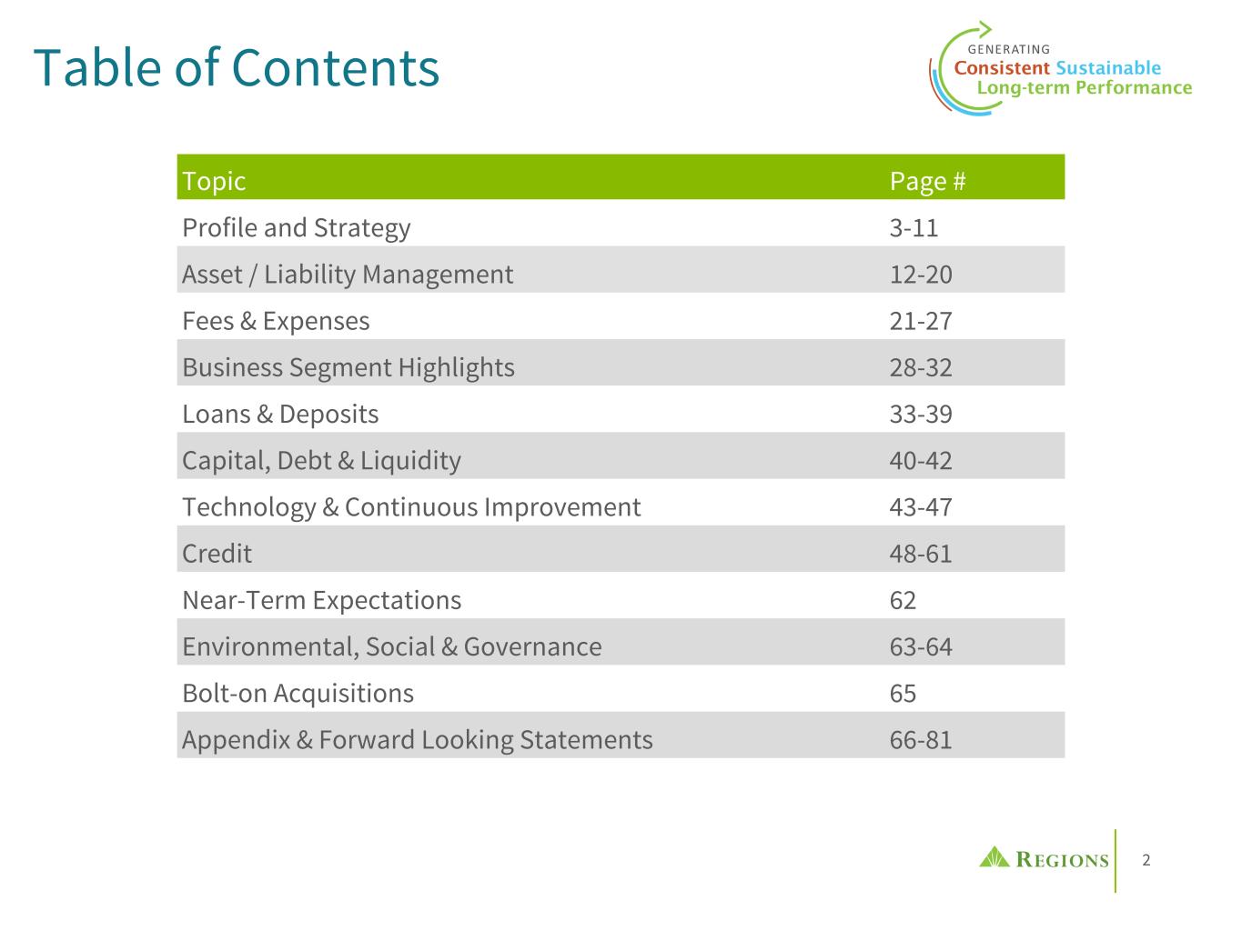 2 Table of Contents Topic Page # Profile and Strategy 3-11 Asset / Liability Management 12-20 Fees & Expenses 21-27 Business Segment Highlights 28-32 Loans & Deposits 33-39 Capital, Debt & Liquidity 40-42 Technology & Continuous Improvement 43-47 Credit 48-61 Near-Term Expectations 62 Environmental, Social & Governance 63-64 Bolt-on Acquisitions 65 Appendix & Forward Looking Statements 66-81
