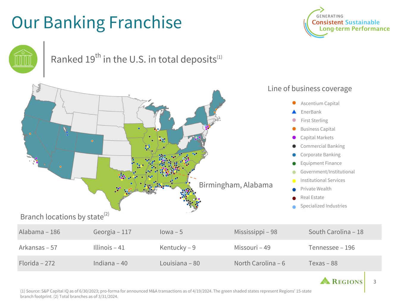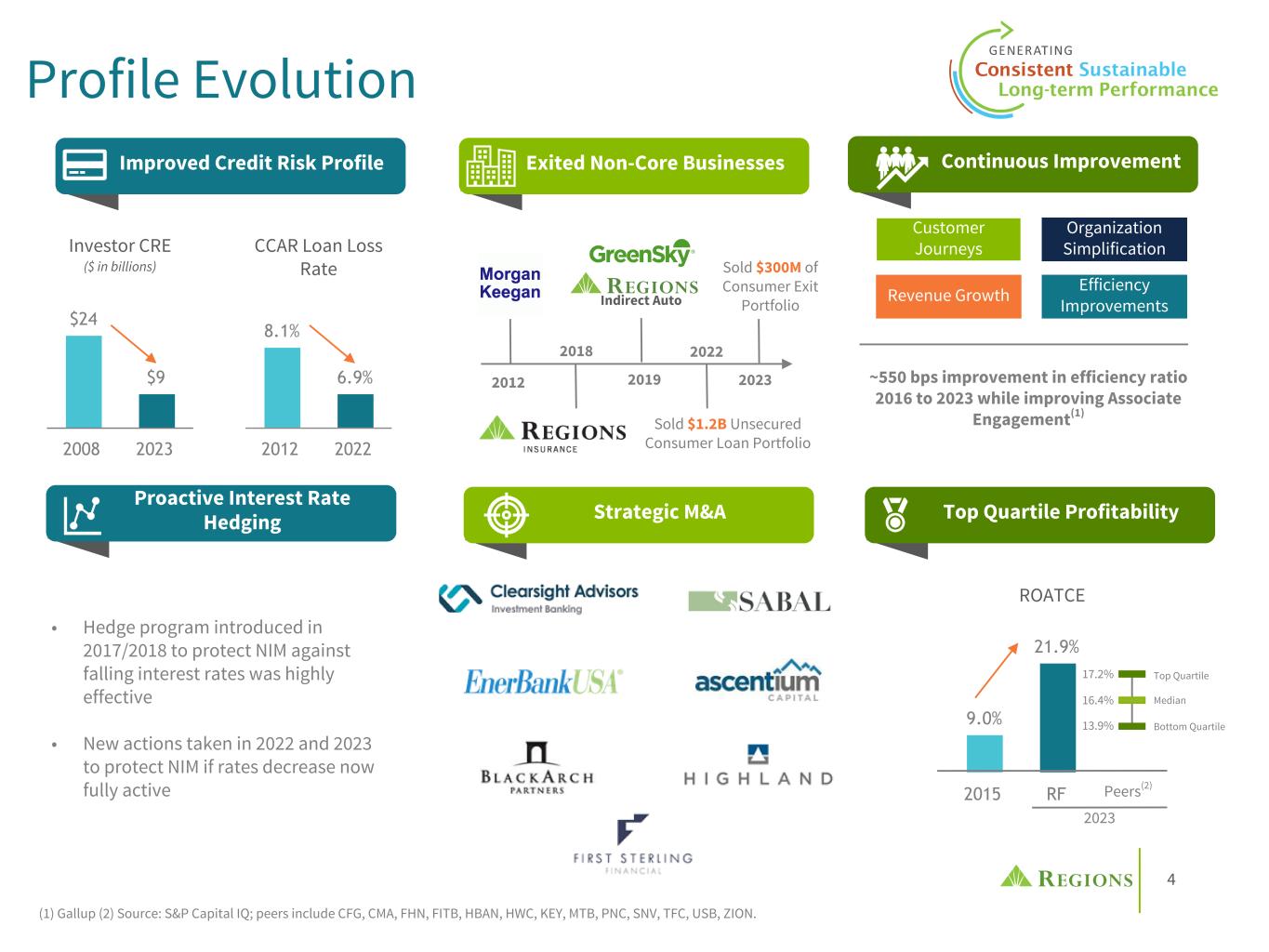 3 Line of business coverage Alabama – 186 Georgia – 117 Iowa – 5 Mississippi – 98 South Carolina – 18 Arkansas – 57 Illinois – 41 Kentucky – 9 Missouri – 49 Tennessee – 196 Florida – 272 Indiana – 40 Louisiana – 80 North Carolina – 6 Texas – 88 Ranked 19th in the U.S. in total deposits(1) Branch locations by state(2) Our Banking Franchise Birmingham, Alabama (1) Source: S&P Capital IQ as of 6/30/2023; pro-forma for announced M&A transactions as of 4/19/2024. The green shaded states represent Regions' 15-state branch footprint. (2) Total branches as of 3/31/2024. First Sterling Ascentium Capital Business Capital Capital Markets Commercial Banking Corporate Banking Equipment Finance Government/Institutional Institutional Services Private Wealth Real Estate Specialized Industries EnerBank