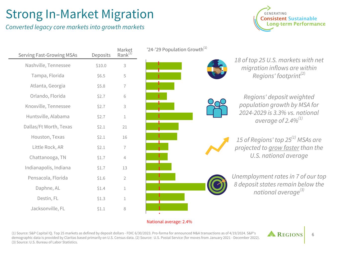5 Top Market Share Plays valuable role in the competitive landscape (1) Based on MSA and non-MSA counties using FDIC deposit data as of 6/30/2023; pro-forma for announced M&A transactions as of 4/19/2024. (2) Significant money center bank presence (JPM, BAC, C, WFC) defined as combined market share using 6/30/2023 FDIC deposit data of 20% or more. Markets with top 5 market share(1) MSAs Non-MSA counties • Ranked 19th in the U.S. in total deposits(1) • 86% of deposits in 7 states: Alabama, Tennessee, Florida, Louisiana, Mississippi, Georgia, Arkansas • Top 5 or better market share in ~70% of MSAs across 15-state footprint(1) • Greater than 2/3 of deposits in markets without a significant money center bank presence(2) • High growth markets benefiting from population and business growth: • Florida • Georgia • Texas • Tennessee