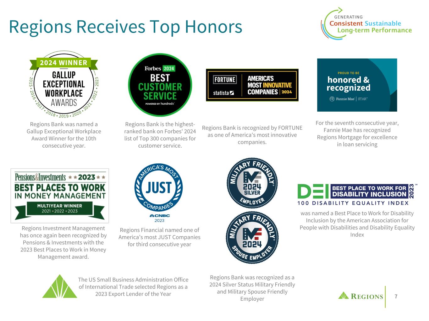 7 Regions Receives Top Honors Regions Bank was recognized as a 2024 Silver Status Military Friendly and Military Spouse Friendly Employer Regions Bank was named a Gallup Exceptional Workplace Award Winner for the 10th consecutive year. For the third consecutive year, Regions Bank was named a Best Place to Work for Disability Inclusion by the American Association for People with Disabilities and Disability Equality Index Regions Financial named one of America’s most JUST Companies for third consecutive year The US Small Business Administration Office of International Trade selected Regions as a 2023 Export Lender of the Year Regions Bank is the highest- ranked bank on Forbes' 2024 list of Top 300 companies for customer service. Regions Investment Management has once again been recognized by Pensions & Investments with the 2023 Best Places to Work in Money Management award. For the seventh consecutive year, Fannie Mae has recognized Regions Mortgage for excellence in loan servicing Regions Bank is recognized by FORTUNE as one of America's most innovative companies.