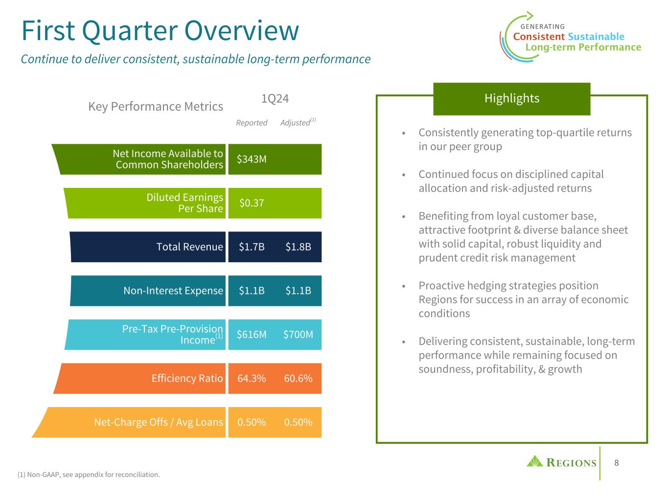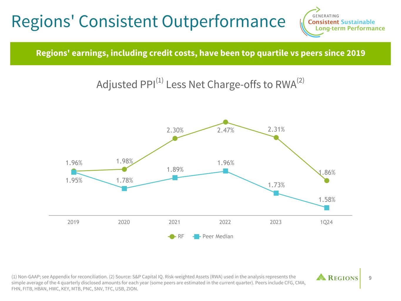 8 First Quarter Overview Continue to deliver consistent, sustainable long-term performance (1) Non-GAAP, see appendix for reconciliation. Key Performance Metrics 1Q24 Reported Adjusted(1) Net Income Available to Common Shareholders $343M Diluted Earnings Per Share $0.37 Total Revenue $1.7B $1.8B Non-Interest Expense $1.1B $1.1B Pre-Tax Pre-Provision Income(1) $616M $700M Efficiency Ratio 64.3% 60.6% Net-Charge Offs / Avg Loans 0.50% 0.50% Highlights • Consistently generating top-quartile returns in our peer group • Continued focus on disciplined capital allocation and risk-adjusted returns • Benefiting from loyal customer base, attractive footprint & diverse balance sheet with solid capital, robust liquidity and prudent credit risk management • Proactive hedging strategies position Regions for success in an array of economic conditions • Delivering consistent, sustainable, long-term performance while remaining focused on soundness, profitability, & growth