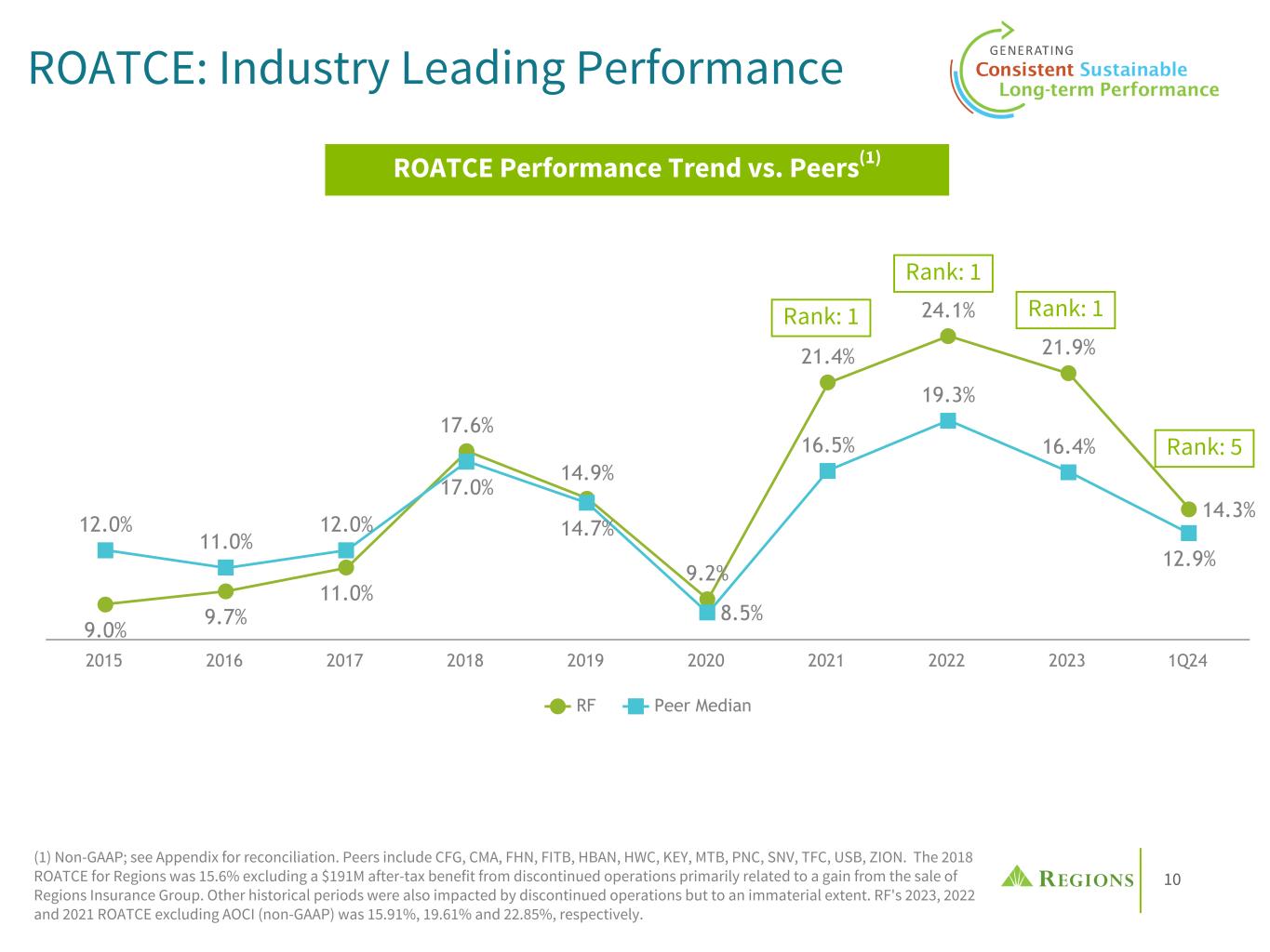9 Regions' Consistent Outperformance Adjusted PPI(1) Less Net Charge-offs to RWA(2) Regions' earnings, including credit costs, have been top quartile vs peers since 2019 1.96% 1.98% 2.30% 2.47% 2.31% 1.86% 1.95% 1.78% 1.89% 1.96% 1.73% 1.58% RF Peer Median 2019 2020 2021 2022 2023 1Q24 (1) Non-GAAP; see Appendix for reconciliation. (2) Source: S&P Capital IQ. Risk-weighted Assets (RWA) used in the analysis represents the simple average of the 4 quarterly disclosed amounts for each year (some peers are estimated in the current quarter). Peers include CFG, CMA, FHN, FITB, HBAN, HWC, KEY, MTB, PNC, SNV, TFC, USB, ZION.