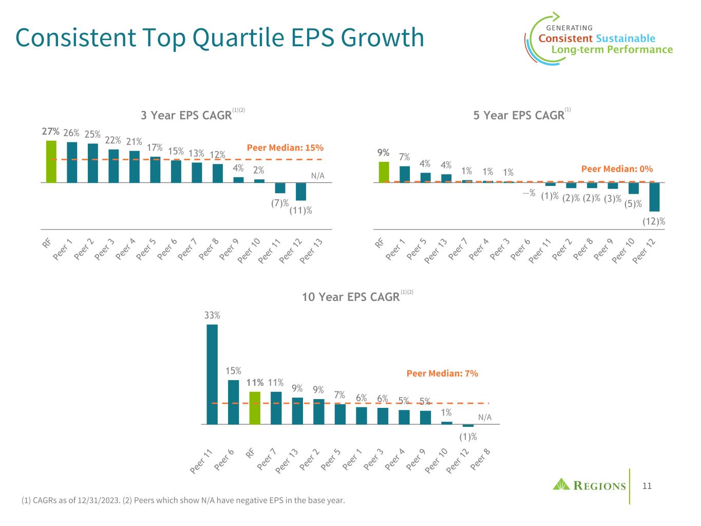 10 ROATCE: Industry Leading Performance 9.0% 9.7% 11.0% 17.6% 14.9% 9.2% 21.4% 24.1% 21.9% 14.3% 12.0% 11.0% 12.0% 17.0% 14.7% 8.5% 16.5% 19.3% 16.4% 12.9% RF Peer Median 2015 2016 2017 2018 2019 2020 2021 2022 2023 1Q24 ROATCE Performance Trend vs. Peers(1) (1) Non-GAAP; see Appendix for reconciliation. Peers include CFG, CMA, FHN, FITB, HBAN, HWC, KEY, MTB, PNC, SNV, TFC, USB, ZION. The 2018 ROATCE for Regions was 15.6% excluding a $191M after-tax benefit from discontinued operations primarily related to a gain from the sale of Regions Insurance Group. Other historical periods were also impacted by discontinued operations but to an immaterial extent. RF's 2023, 2022 and 2021 ROATCE excluding AOCI (non-GAAP) was 15.91%, 19.61% and 22.85%, respectively. Rank: 1 Rank: 1 Rank: 1 Rank: 5