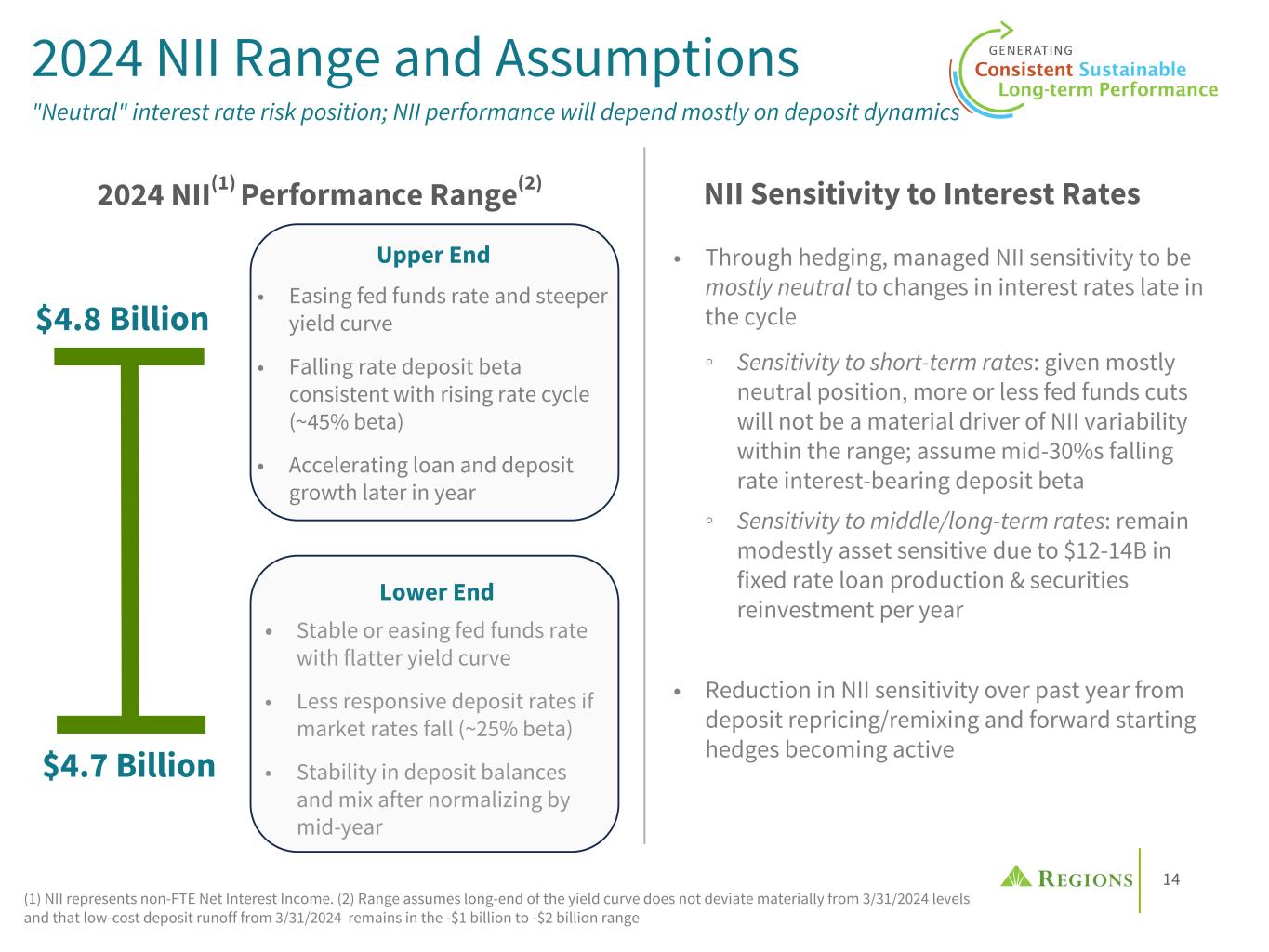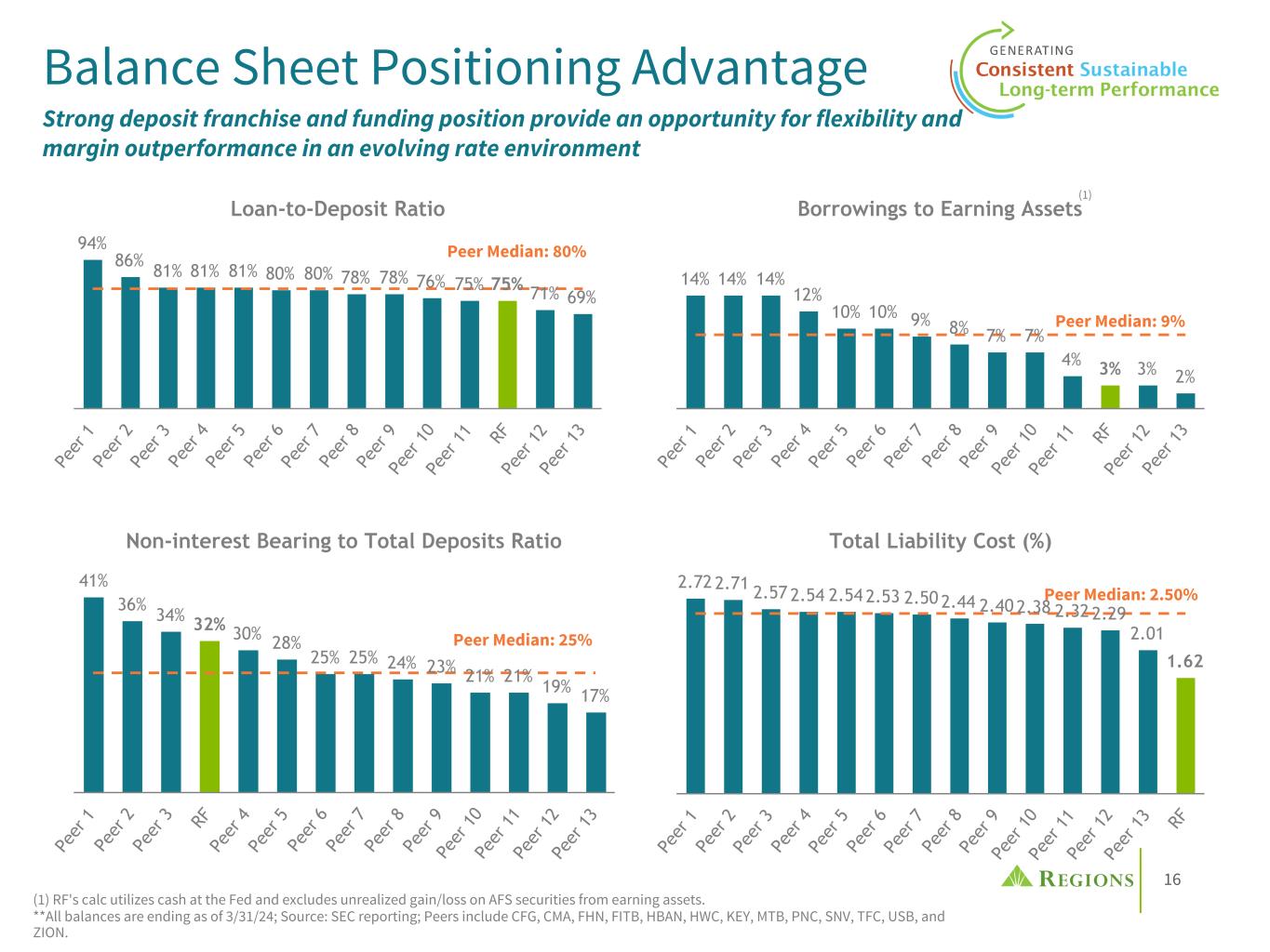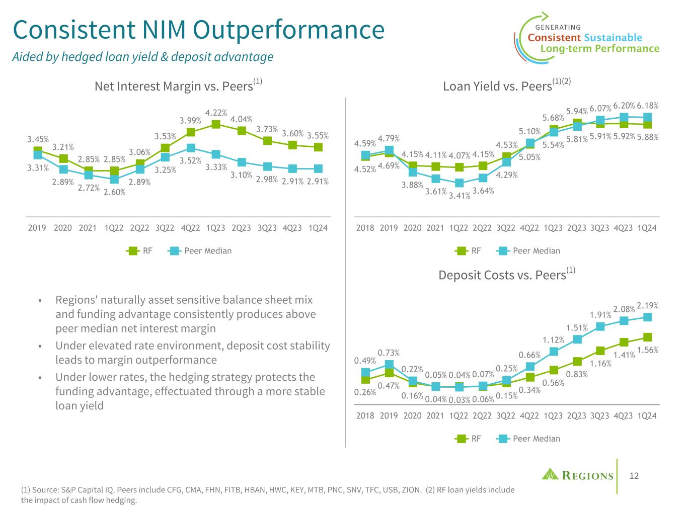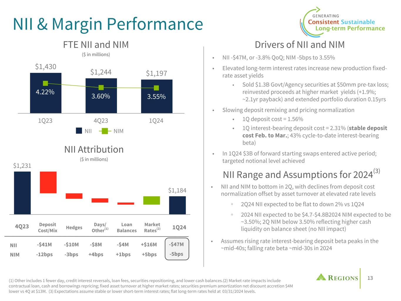 12 4.52% 4.69% 4.15% 4.11% 4.07% 4.15% 4.53% 5.05% 5.68% 5.94% 5.91% 5.92% 5.88% 4.59% 4.79% 3.88% 3.61% 3.41% 3.64% 4.29% 5.10% 5.54% 5.81% 6.07% 6.20% 6.18% RF Peer Median 2018 2019 2020 2021 1Q22 2Q22 3Q22 4Q22 1Q23 2Q23 3Q23 4Q23 1Q24 Consistent NIM Outperformance Aided by hedged loan yield & deposit advantage (1) Source: S&P Capital IQ. Peers include CFG, CMA, FHN, FITB, HBAN, HWC, KEY, MTB, PNC, SNV, TFC, USB, ZION. (2) RF loan yields include the impact of cash flow hedging. Net Interest Margin vs. Peers(1) 3.45% 3.21% 2.85% 2.85% 3.06% 3.53% 3.99% 4.22% 4.04% 3.73% 3.60% 3.55% 3.31% 2.89% 2.72% 2.60% 2.89% 3.25% 3.52% 3.33% 3.10% 2.98% 2.91% 2.91% RF Peer Median 2019 2020 2021 1Q22 2Q22 3Q22 4Q22 1Q23 2Q23 3Q23 4Q23 1Q24 Loan Yield vs. Peers(1)(2) • Regions' naturally asset sensitive balance sheet mix and funding advantage consistently produces above peer median net interest margin • Under elevated rate environment, deposit cost stability leads to margin outperformance • Under lower rates, the hedging strategy protects the funding advantage, effectuated through a more stable loan yield 0.26% 0.47% 0.16% 0.05% 0.04% 0.06% 0.15% 0.34% 0.56% 0.83% 1.16% 1.41% 1.56% 0.49% 0.73% 0.22% 0.04% 0.03% 0.07% 0.25% 0.66% 1.12% 1.51% 1.91% 2.08% 2.19% RF Peer Median 2018 2019 2020 2021 1Q22 2Q22 3Q22 4Q22 1Q23 2Q23 3Q23 4Q23 1Q24 Deposit Costs vs. Peers(1)