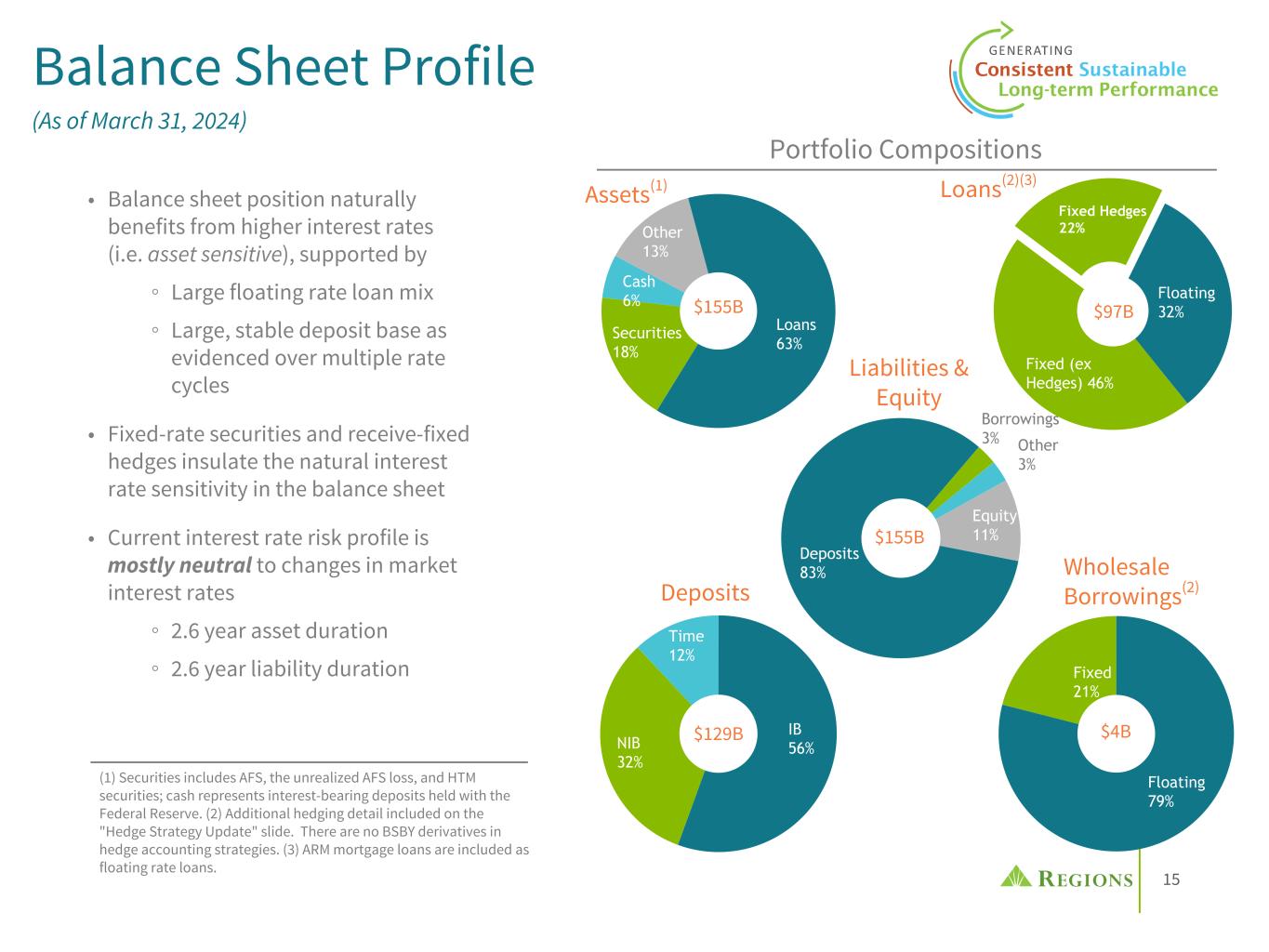 14 • Stable or easing fed funds rate with flatter yield curve • Less responsive deposit rates if market rates fall (~25% beta) • Stability in deposit balances and mix after normalizing by mid-year • Through hedging, managed NII sensitivity to be mostly neutral to changes in interest rates late in the cycle ◦ Sensitivity to short-term rates: given mostly neutral position, more or less fed funds cuts will not be a material driver of NII variability within the range; assume mid-30%s falling rate interest-bearing deposit beta ◦ Sensitivity to middle/long-term rates: remain modestly asset sensitive due to $12-14B in fixed rate loan production & securities reinvestment per year • Reduction in NII sensitivity over past year from deposit repricing/remixing and forward starting hedges becoming active 2024 NII Range and Assumptions "Neutral" interest rate risk position; NII performance will depend mostly on deposit dynamics (1) NII represents non-FTE Net Interest Income. (2) Range assumes long-end of the yield curve does not deviate materially from 3/31/2024 levels and that low-cost deposit runoff from 3/31/2024 remains in the -$1 billion to -$2 billion range $4.8 Billion $4.7 Billion 2024 NII(1) Performance Range(2) NII Sensitivity to Interest Rates Lower End • Easing fed funds rate and steeper yield curve • Falling rate deposit beta consistent with rising rate cycle (~45% beta) • Accelerating loan and deposit growth later in year Upper End