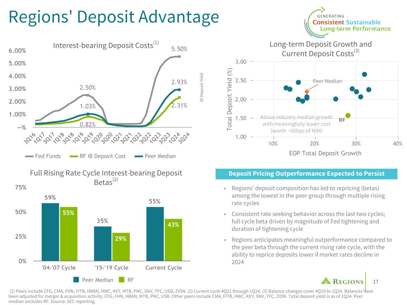 16 Balance Sheet Positioning Advantage Strong deposit franchise and funding position provide an opportunity for flexibility and margin outperformance in an evolving rate environment (1) RF's calc utilizes cash at the Fed and excludes unrealized gain/loss on AFS securities from earning assets. **All balances are ending as of 3/31/24; Source: SEC reporting; Peers include CFG, CMA, FHN, FITB, HBAN, HWC, KEY, MTB, PNC, SNV, TFC, USB, and ZION. Loan-to-Deposit Ratio 94% 86% 81% 81% 81% 80% 80% 78% 78% 76% 75% 75% 71% 69% Pe er 1 Pe er 2 Pe er 3 Pe er 4 Pe er 5 Pe er 6 Pe er 7 Pe er 8 Pe er 9 Pe er 1 0 Pe er 1 1 RF Pe er 1 2 Pe er 1 3 Non-interest Bearing to Total Deposits Ratio 41% 36% 34% 32% 30% 28% 25% 25% 24% 23% 21% 21% 19% 17% Pe er 1 Pe er 2 Pe er 3 RF Pe er 4 Pe er 5 Pe er 6 Pe er 7 Pe er 8 Pe er 9 Pe er 1 0 Pe er 1 1 Pe er 1 2 Pe er 1 3 Peer Median: 80% Peer Median: 25% Total Liability Cost (%) 2.72 2.71 2.57 2.54 2.54 2.53 2.50 2.44 2.40 2.38 2.32 2.29 2.01 1.62 Pe er 1 Pe er 2 Pe er 3 Pe er 4 Pe er 5 Pe er 6 Pe er 7 Pe er 8 Pe er 9 Pe er 1 0 Pe er 1 1 Pe er 1 2 Pe er 1 3 RF Peer Median: 2.50% (1) Borrowings to Earning Assets 14% 14% 14% 12% 10% 10% 9% 8% 7% 7% 4% 3% 3% 2% Pe er 1 Pe er 2 Pe er 3 Pe er 4 Pe er 5 Pe er 6 Pe er 7 Pe er 8 Pe er 9 Pe er 1 0 Pe er 1 1 RF Pe er 1 2 Pe er 1 3 Peer Median: 9%