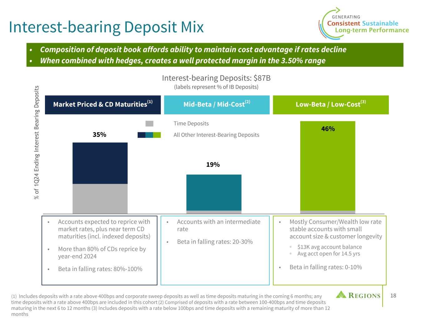 17 • Regions' deposit composition has led to repricing (betas) among the lowest in the peer group through multiple rising rate cycles • Consistent rate seeking behavior across the last two cycles; full cycle beta driven by magnitude of Fed tightening and duration of tightening cycle • Regions anticipates meaningful outperformance compared to the peer beta through the current rising rate cycle, with the ability to reprice deposits lower if market rates decline in 2024 2.50% 5.50% 0.82% 2.31%1.03% 2.93% Fed Funds RF IB Deposit Cost Peer Median 3Q 16 1Q 17 3Q 17 1Q 18 3Q 18 1Q 19 3Q 19 1Q 20 3Q 20 1Q 21 3Q 21 1Q 22 3Q 22 1Q 23 3Q 23 1Q 24 3Q 24 —% 1.00% 2.00% 3.00% 4.00% 5.00% 6.00% 59% 35% 55% 55% 29% 43% Peer Median RF '04-'07 Cycle '15-'19 Cycle Current Cycle 0% 25% 50% 75% (1) Peers include CFG, CMA, FHN, FITB, HBAN, HWC, KEY, MTB, PNC, SNV, TFC, USB, ZION. (2) Current cycle 4Q21 through 1Q24. (3) Balance changes cover 4Q19 to 1Q24. Balances have been adjusted for merger & acquisition activity: CFG, FHN, HBAN, MTB, PNC, USB. Other peers include CMA, FITB, HWC, KEY, SNV, TFC, ZION. Total deposit yield is as of 1Q24. Peer median excludes RF. Source: SEC reporting. Regions' Deposit Advantage Deposit Pricing Outperformance Expected to Persist Interest-bearing Deposit Costs(1) Full Rising Rate Cycle Interest-bearing Deposit Betas(2) Long-term Deposit Growth and Current Deposit Costs(3) IB D ep os it Yi el d EOP Total Deposit Growth To ta l D ep os it Y ie ld ( %) 10% 20% 30% 40% 1.00 1.50 2.00 2.50 3.00 RF Peer Median Above industry median growth with meaningfully lower cost (worth ~60bps of NIM)