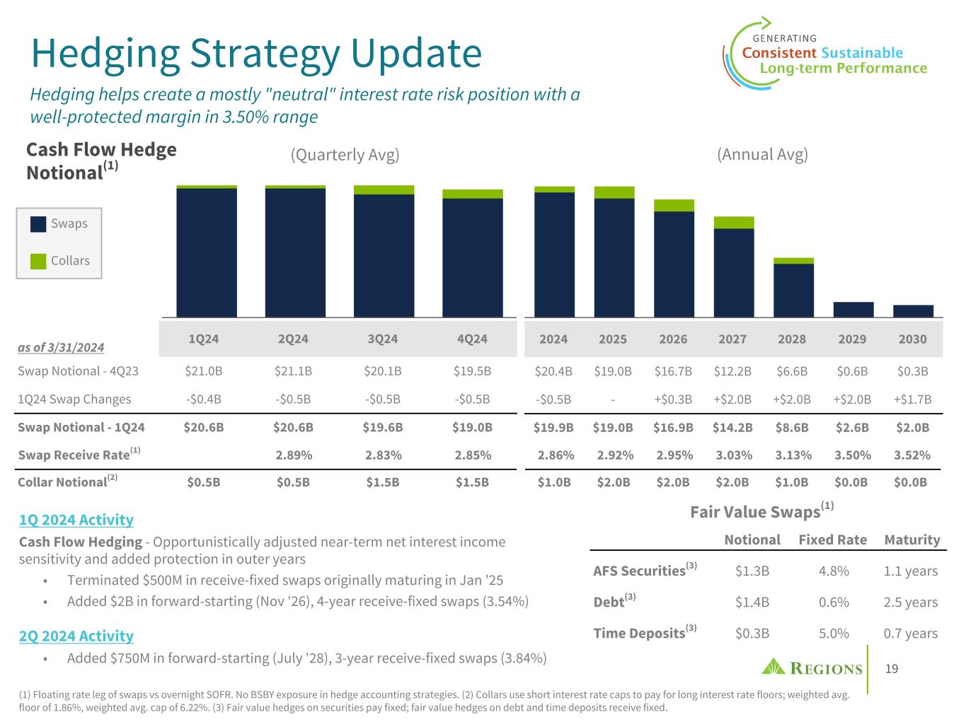 18 % of 1 Q 24 E nd in g In te re st B ea ri ng D ep os it s Interest-bearing Deposits: $87B (labels represent % of IB Deposits) • Accounts with an intermediate rate • Beta in falling rates: 20-30% • Mostly Consumer/Wealth low rate stable accounts with small account size & customer longevity ◦ $13K avg account balance ◦ Avg acct open for 14.5 yrs • Beta in falling rates: 0-10% Interest-bearing Deposit Mix • Accounts expected to reprice with market rates, plus near term CD maturities (incl. indexed deposits) • More than 80% of CDs reprice by year-end 2024 • Beta in falling rates: 80%-100% • Composition of deposit book affords ability to maintain cost advantage if rates decline • When combined with hedges, creates a well protected margin in the 3.50% range Low-Beta / Low-Cost(3)Market Priced & CD Maturities(1) (1) Includes deposits with a rate above 400bps and corporate sweep deposits as well as time deposits maturing in the coming 6 months; any time deposits with a rate above 400bps are included in this cohort (2) Comprised of deposits with a rate between 100-400bps and time deposits maturing in the next 6 to 12 months (3) Includes deposits with a rate below 100bps and time deposits with a remaining maturity of more than 12 months Mid-Beta / Mid-Cost(2) Time Deposits All Other Interest-Bearing Deposits35% 17% 19% 46%