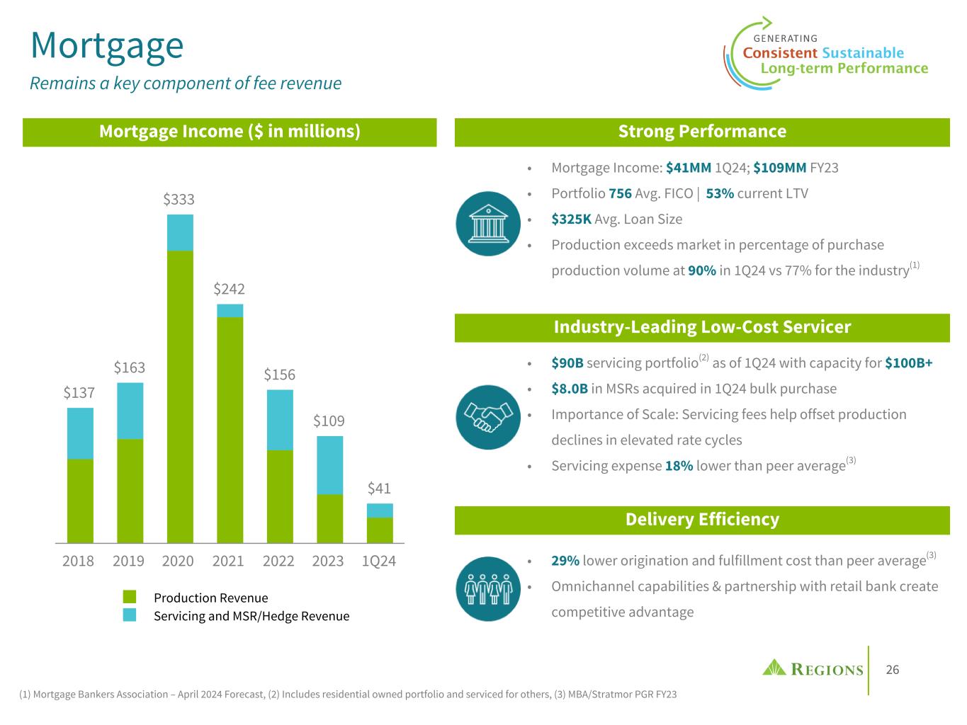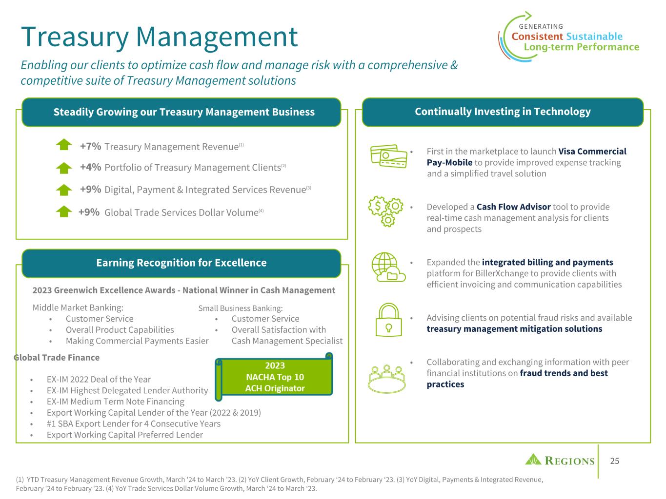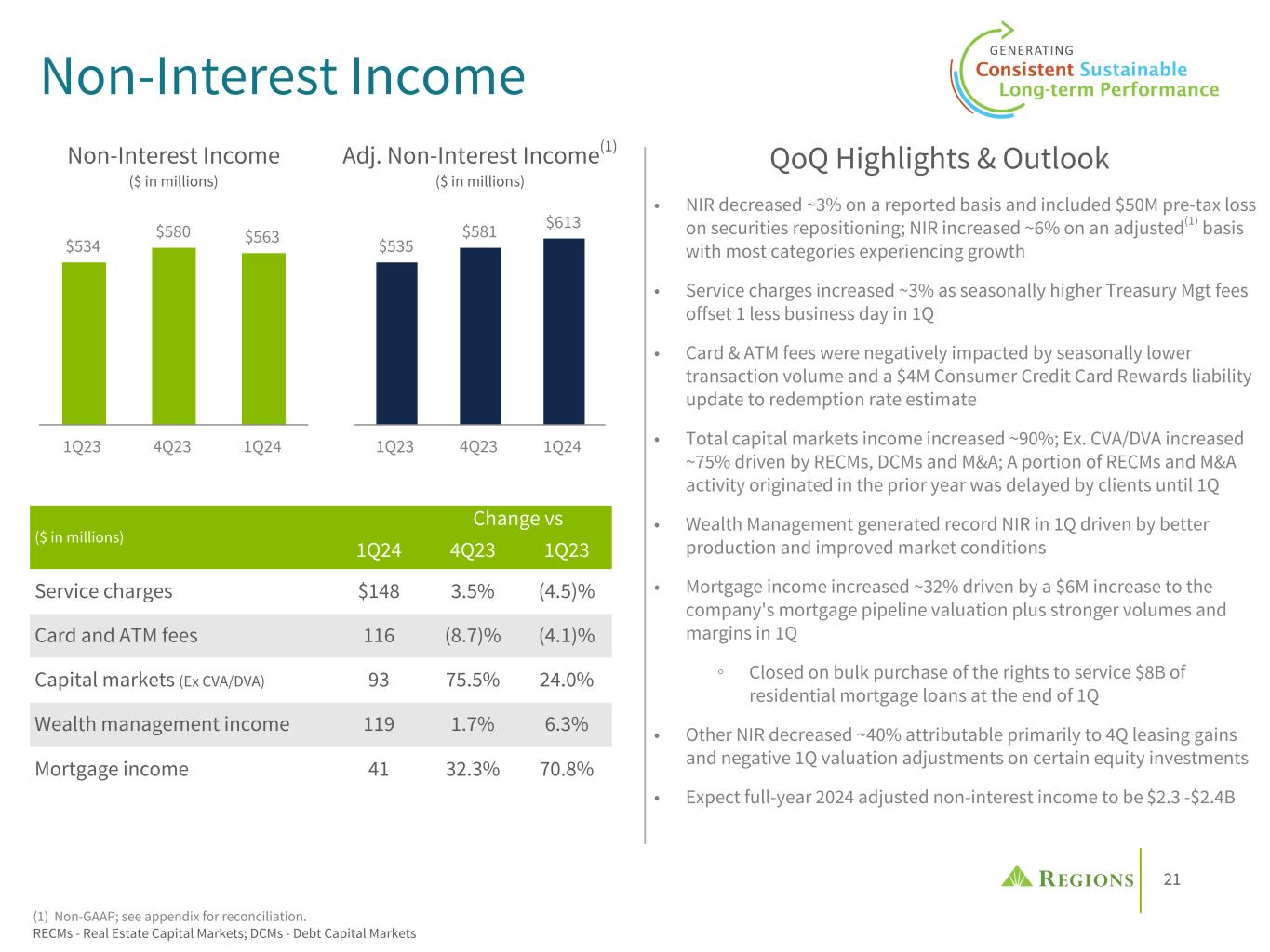 23 Track Record of Expanding Fee Based Services Proven Non-Interest Income Resiliency $2,109 $2,259 2011 2012 2013 2014 2015 2016 2017 2018 2019 2020 2021 2022 2023 Adjusted Non-Interest Income(1)(2) Strategic investments & enhanced client capabilities have generated ~ $700M in additional revenue since the GFC, more than overcoming $540M of lost revenue • The enactment of Regulation E and debit interchange legislation had a combined ~$300M negative impact • Overdraft fees have declined over $240M since 2011, due in part to customer friendly product enhancements • Evaluating proposed rules impacting Overdraft Fees & Debit Interchange Caps Diversified revenue growth through expanded fee-based services (1) Non-GAAP; see appendix for reconciliation. (2) 2011-2013 adj. NIR was not restated to exclude Regions Insurance revenue, which was moved to discontinued operations after 2018 divestiture. (3) Highland Associates acquired in 2019; Contributed $9M of NIR in 2023 . ($ in millions) Capital Markets • Post the sale of Morgan Keegan in 2012, expanded the business through: ◦ Organic Product Growth: Debt & Capital Raising, Financial Risk Management, Real Estate ◦ Acquisitions: BlackArch – M&A, Clearsight – M&A, Sabal – Agency Small Balance & Servicing Platform Treasury Management • New product development since 2011 accounts for 25% of annual core Treasury Management revenue • A focus on cash centric conversations and value orientation have led to peer leading revenue realization and client retention Wealth Management • Divestiture of RIG in 2018 reduced WM NIR ~($140M) annually; 2023 Investment Services and Investment Management & Trust Fees are up $160M vs 2017 (95% Organic3); 7-year CAGR of 6.5% • Acquisitions: Highland Associates3 Consumer • Purchased a $1B credit card portfolio in mid-2011 • Organic growth in the debit card portfolio • Since 2011 expanded mortgage servicing revenue through bulk and flow MSR acquisitions totaling $78B