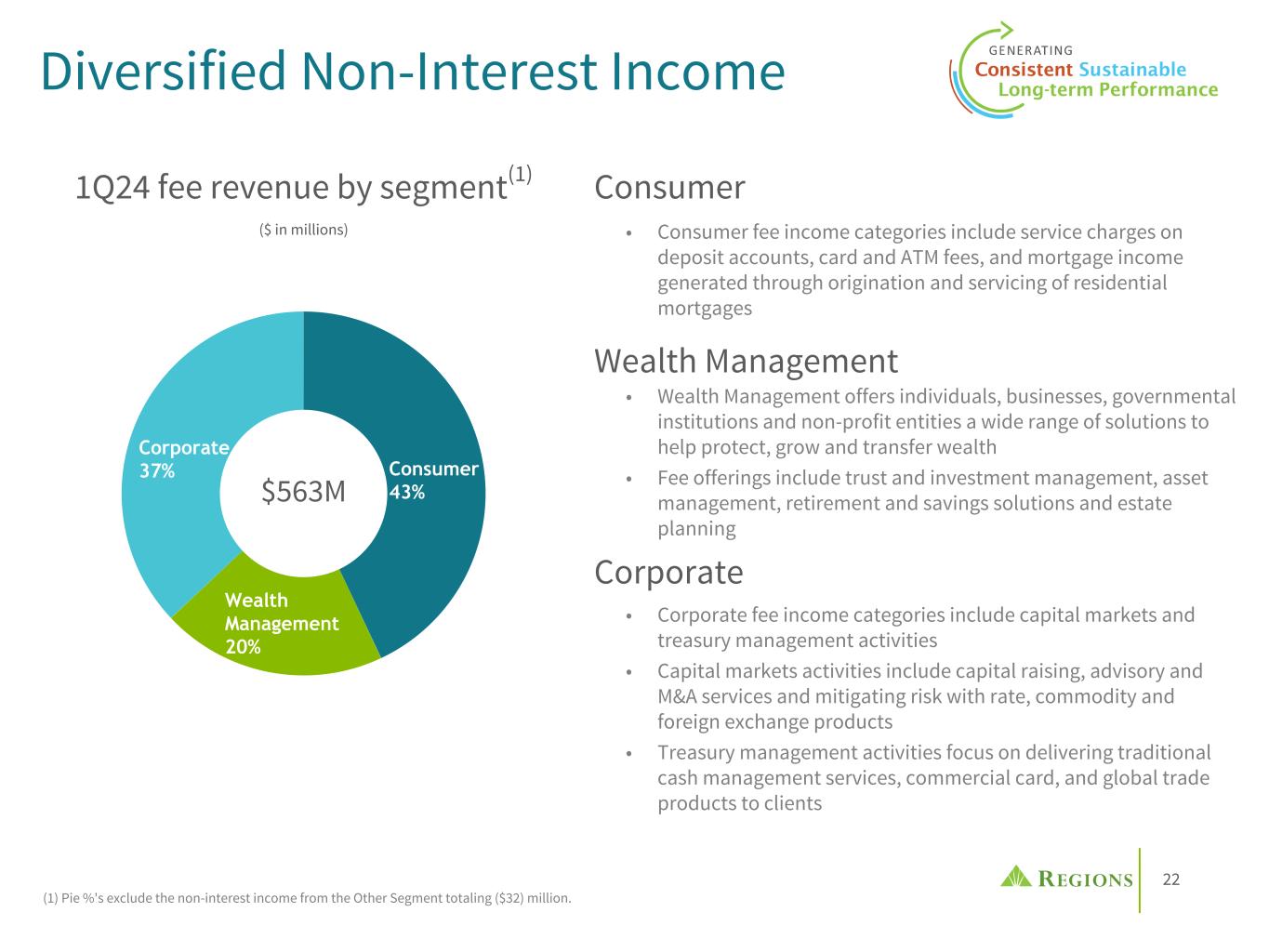 21 $535 $581 $613 1Q23 4Q23 1Q24 ($ in millions) Change vs 1Q24 4Q23 1Q23 Service charges $148 3.5% (4.5)% Card and ATM fees 116 (8.7)% (4.1)% Capital markets (Ex CVA/DVA) 93 75.5% 24.0% Wealth management income 119 1.7% 6.3% Mortgage income 41 32.3% 70.8% Non-Interest Income (1) Non-GAAP; see appendix for reconciliation. RECMs - Real Estate Capital Markets; DCMs - Debt Capital Markets • NIR decreased ~3% on a reported basis and included $50M pre-tax loss on securities repositioning; NIR increased ~6% on an adjusted(1) basis with most categories experiencing growth • Service charges increased ~3% as seasonally higher Treasury Mgt fees offset 1 less business day in 1Q • Card & ATM fees were negatively impacted by seasonally lower transaction volume and a $4M Consumer Credit Card Rewards liability update to redemption rate estimate • Total capital markets income increased ~90%; Ex. CVA/DVA increased ~75% driven by RECMs, DCMs and M&A; A portion of RECMs and M&A activity originated in the prior year was delayed by clients until 1Q • Wealth Management generated record NIR in 1Q driven by better production and improved market conditions • Mortgage income increased ~32% driven by a $6M increase to the company's mortgage pipeline valuation plus stronger volumes and margins in 1Q ◦ Closed on bulk purchase of the rights to service $8B of residential mortgage loans at the end of 1Q • Other NIR decreased ~40% attributable primarily to 4Q leasing gains and negative 1Q valuation adjustments on certain equity investments • Expect full-year 2024 adjusted non-interest income to be $2.3 -$2.4B $534 $580 $563 1Q23 4Q23 1Q24 QoQ Highlights & OutlookNon-Interest Income ($ in millions) Adj. Non-Interest Income(1) ($ in millions)