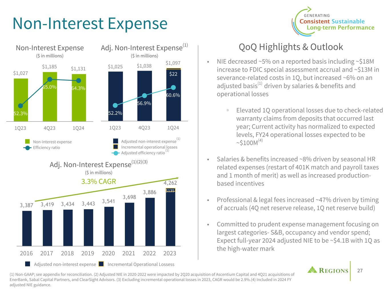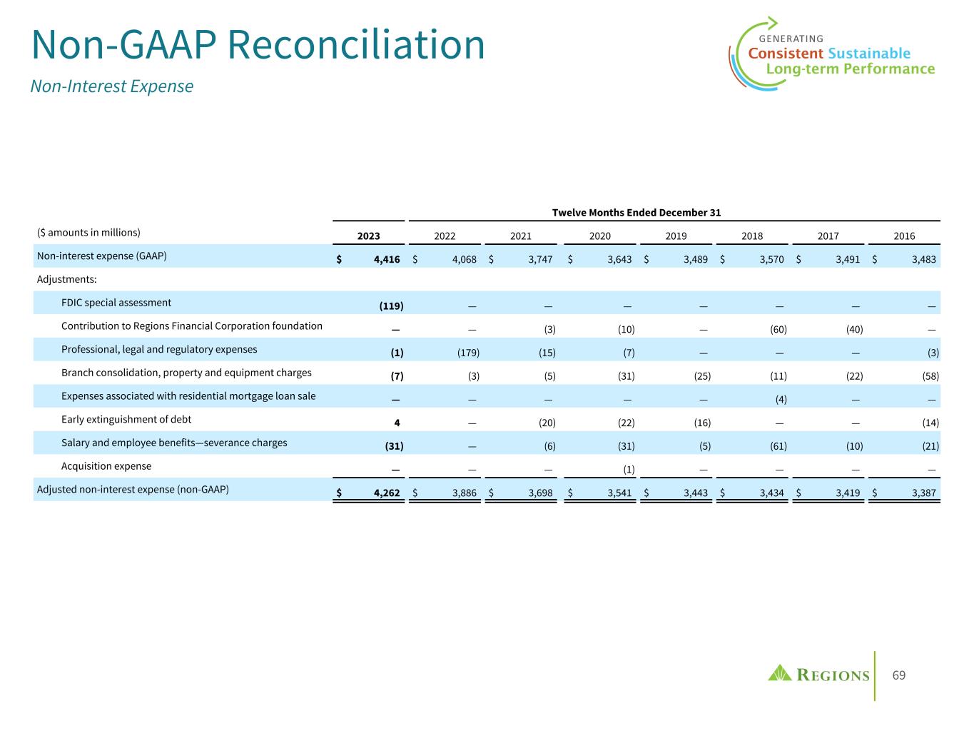 69 Non-GAAP Reconciliation Non-Interest Expense Twelve Months Ended December 31 ($ amounts in millions) 2023 2022 2021 2020 2019 2018 2017 2016 Non-interest expense (GAAP) $ 4,416 $ 4,068 $ 3,747 $ 3,643 $ 3,489 $ 3,570 $ 3,491 $ 3,483 Adjustments: FDIC special assessment (119) — — — — — — — Contribution to Regions Financial Corporation foundation — — (3) (10) — (60) (40) — Professional, legal and regulatory expenses (1) (179) (15) (7) — — — (3) Branch consolidation, property and equipment charges (7) (3) (5) (31) (25) (11) (22) (58) Expenses associated with residential mortgage loan sale — — — — — (4) — — Early extinguishment of debt 4 — (20) (22) (16) — — (14) Salary and employee benefits—severance charges (31) — (6) (31) (5) (61) (10) (21) Acquisition expense — — — (1) — — — — Adjusted non-interest expense (non-GAAP) $ 4,262 $ 3,886 $ 3,698 $ 3,541 $ 3,443 $ 3,434 $ 3,419 $ 3,387