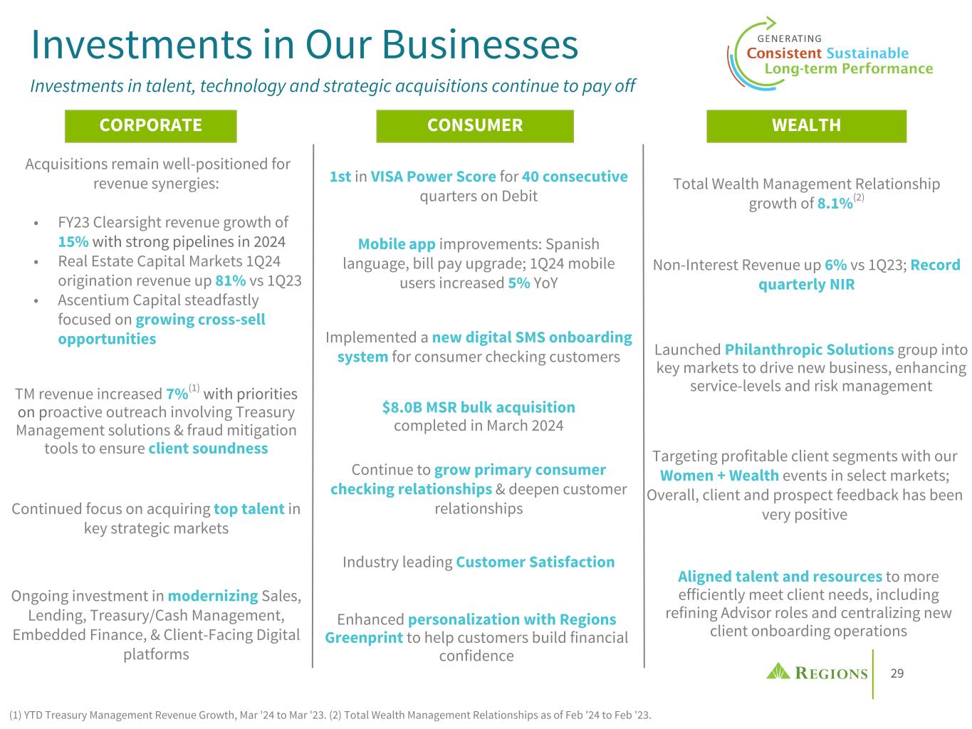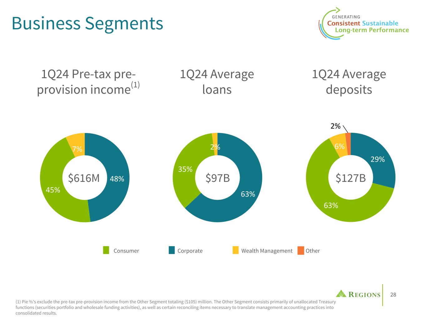 28 48% 45% 7% 63% 35% 2% 29% 63% 6% 2% $616M $97B $127B 1Q24 Pre-tax pre- provision income(1) 1Q24 Average deposits 1Q24 Average loans (1) Pie %'s exclude the pre-tax pre-provision income from the Other Segment totaling ($105) million. The Other Segment consists primarily of unallocated Treasury functions (securities portfolio and wholesale funding activities), as well as certain reconciling items necessary to translate management accounting practices into consolidated results. Business Segments Consumer Corporate Wealth Management Other