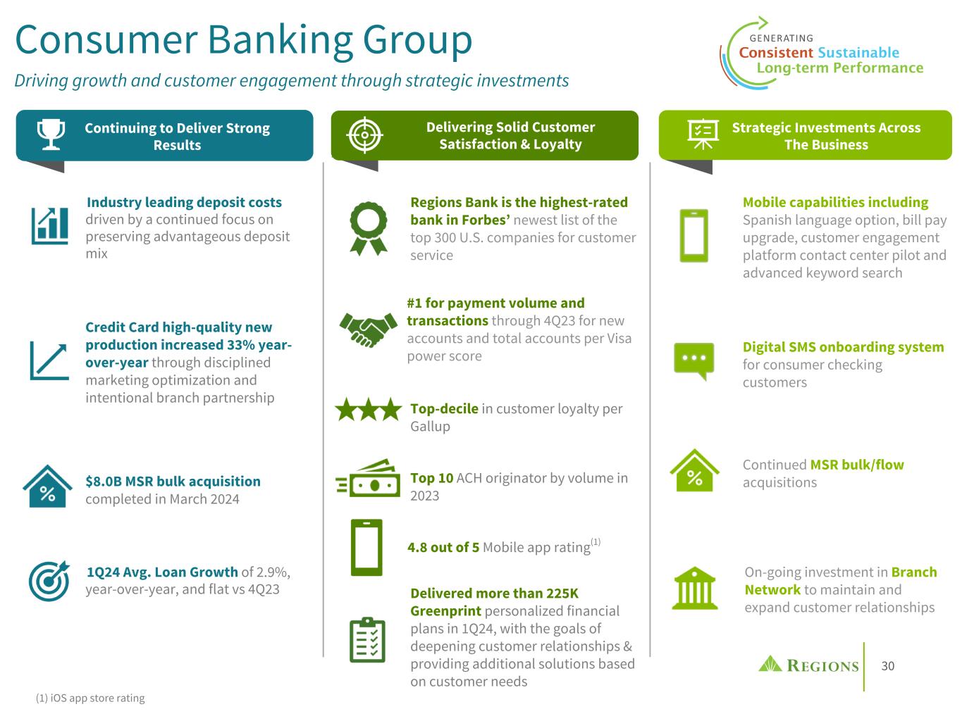 29 (1) YTD Treasury Management Revenue Growth, Mar '24 to Mar '23. (2) Total Wealth Management Relationships as of Feb '24 to Feb '23. Investments in Our Businesses Investments in talent, technology and strategic acquisitions continue to pay off CORPORATE CONSUMER WEALTH Mobile app improvements: Spanish language, bill pay upgrade; 1Q24 mobile users increased 5% YoY Total Wealth Management Relationship growth of 8.1%(2) Acquisitions remain well-positioned for revenue synergies: • FY23 Clearsight revenue growth of 15% with strong pipelines in 2024 • Real Estate Capital Markets 1Q24 origination revenue up 81% vs 1Q23 • Ascentium Capital steadfastly focused on growing cross-sell opportunities Targeting profitable client segments with our Women + Wealth events in select markets; Overall, client and prospect feedback has been very positive Industry leading Customer Satisfaction $8.0B MSR bulk acquisition completed in March 2024 1st in VISA Power Score for 40 consecutive quarters on Debit Non-Interest Revenue up 6% vs 1Q23; Record quarterly NIR Aligned talent and resources to more efficiently meet client needs, including refining Advisor roles and centralizing new client onboarding operations Continue to grow primary consumer checking relationships & deepen customer relationships TM revenue increased 7%(1) with priorities on proactive outreach involving Treasury Management solutions & fraud mitigation tools to ensure client soundness Ongoing investment in modernizing Sales, Lending, Treasury/Cash Management, Embedded Finance, & Client-Facing Digital platforms Implemented a new digital SMS onboarding system for consumer checking customers Continued focus on acquiring top talent in key strategic markets Launched Philanthropic Solutions group into key markets to drive new business, enhancing service-levels and risk management Enhanced personalization with Regions Greenprint to help customers build financial confidence
