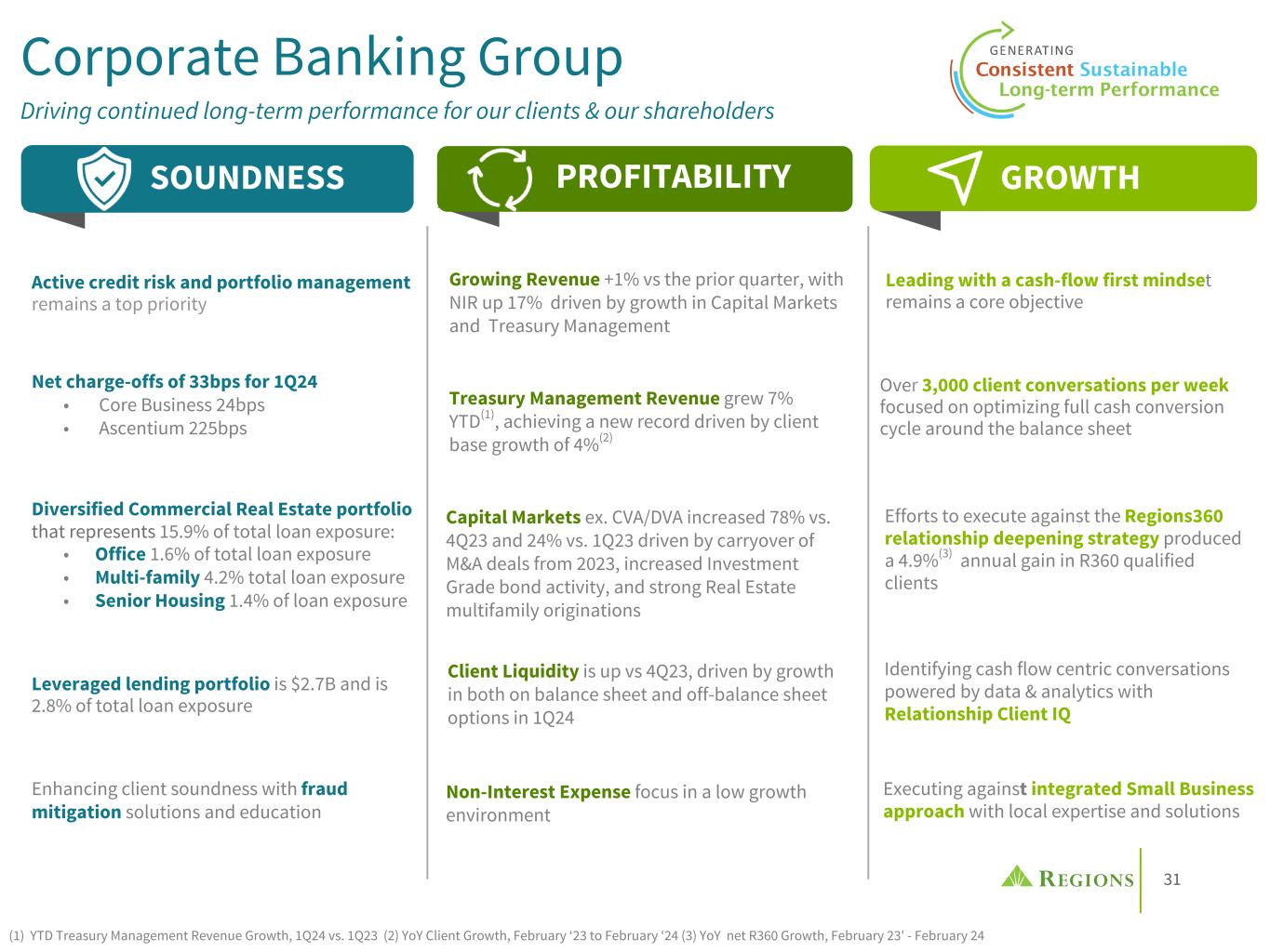 30 Consumer Banking Group Driving growth and customer engagement through strategic investments Continuing to Deliver Strong Results $8.0B MSR bulk acquisition completed in March 2024 Industry leading deposit costs driven by a continued focus on preserving advantageous deposit mix Mobile capabilities including Spanish language option, bill pay upgrade, customer engagement platform contact center pilot and advanced keyword search 1Q24 Avg. Loan Growth of 2.9%, year-over-year, and flat vs 4Q23 Delivering Solid Customer Satisfaction & Loyalty Strategic Investments Across The Business Credit Card high-quality new production increased 33% year- over-year through disciplined marketing optimization and intentional branch partnership Top-decile in customer loyalty per Gallup Delivered more than 225K Greenprint personalized financial plans in 1Q24, with the goals of deepening customer relationships & providing additional solutions based on customer needs #1 for payment volume and transactions through 4Q23 for new accounts and total accounts per Visa power score 4.8 out of 5 Mobile app rating(1) Regions Bank is the highest-rated bank in Forbes’ newest list of the top 300 U.S. companies for customer service Digital SMS onboarding system for consumer checking customers Continued MSR bulk/flow acquisitions On-going investment in Branch Network to maintain and expand customer relationships (1) iOS app store rating Top 10 ACH originator by volume in 2023