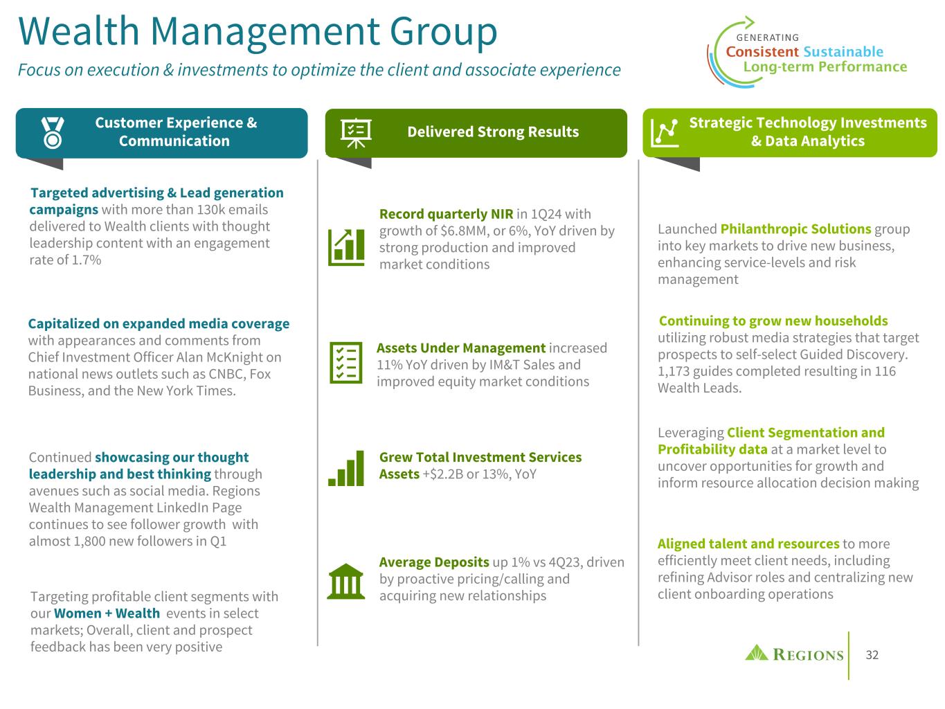 31 Corporate Banking Group Driving continued long-term performance for our clients & our shareholders SOUNDNESS GROWTHPROFITABILITY Diversified Commercial Real Estate portfolio that represents 15.9% of total loan exposure: • Office 1.6% of total loan exposure • Multi-family 4.2% total loan exposure • Senior Housing 1.4% of loan exposure Growing Revenue +1% vs the prior quarter, with NIR up 17% driven by growth in Capital Markets and Treasury Management Client Liquidity is up vs 4Q23, driven by growth in both on balance sheet and off-balance sheet options in 1Q24 Over 3,000 client conversations per week focused on optimizing full cash conversion cycle around the balance sheet Efforts to execute against the Regions360 relationship deepening strategy produced a 4.9%(3) annual gain in R360 qualified clients Identifying cash flow centric conversations powered by data & analytics with Relationship Client IQ Treasury Management Revenue grew 7% YTD(1), achieving a new record driven by client base growth of 4%(2) Net charge-offs of 33bps for 1Q24 • Core Business 24bps • Ascentium 225bps (1) YTD Treasury Management Revenue Growth, 1Q24 vs. 1Q23 (2) YoY Client Growth, February ‘23 to February ‘24 (3) YoY net R360 Growth, February 23' - February 24 Leveraged lending portfolio is $2.7B and is 2.8% of total loan exposure Non-Interest Expense focus in a low growth environment Active credit risk and portfolio management remains a top priority Enhancing client soundness with fraud mitigation solutions and education Executing against integrated Small Business approach with local expertise and solutions Leading with a cash-flow first mindset remains a core objective Capital Markets ex. CVA/DVA increased 78% vs. 4Q23 and 24% vs. 1Q23 driven by carryover of M&A deals from 2023, increased Investment Grade bond activity, and strong Real Estate multifamily originations