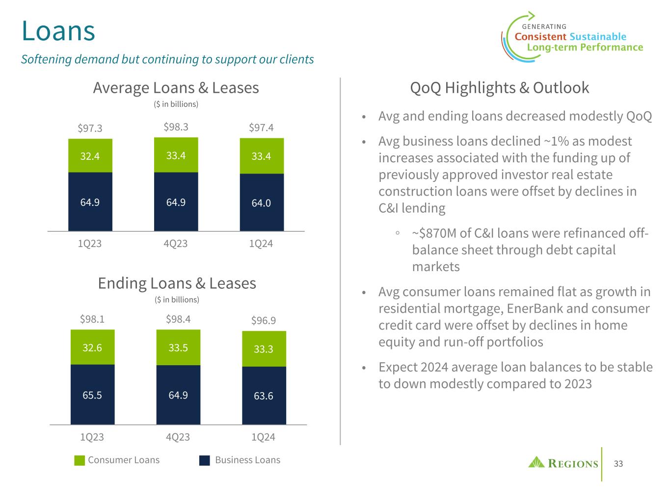 32 Wealth Management Group Focus on execution & investments to optimize the client and associate experience Continued showcasing our thought leadership and best thinking through avenues such as social media. Regions Wealth Management LinkedIn Page continues to see follower growth with almost 1,800 new followers in Q1 Customer Experience & Communication Launched Philanthropic Solutions group into key markets to drive new business, enhancing service-levels and risk management Record quarterly NIR in 1Q24 with growth of $6.8MM, or 6%, YoY driven by strong production and improved market conditions Delivered Strong Results Strategic Technology Investments & Data Analytics Assets Under Management increased 11% YoY driven by IM&T Sales and improved equity market conditions Grew Total Investment Services Assets +$2.2B or 13%, YoY Continuing to grow new households utilizing robust media strategies that target prospects to self-select Guided Discovery. 1,173 guides completed resulting in 116 Wealth Leads. Average Deposits up 1% vs 4Q23, driven by proactive pricing/calling and acquiring new relationships Capitalized on expanded media coverage with appearances and comments from Chief Investment Officer Alan McKnight on national news outlets such as CNBC, Fox Business, and the New York Times. Leveraging Client Segmentation and Profitability data at a market level to uncover opportunities for growth and inform resource allocation decision making Targeting profitable client segments with our Women + Wealth events in select markets; Overall, client and prospect feedback has been very positive Aligned talent and resources to more efficiently meet client needs, including refining Advisor roles and centralizing new client onboarding operations Targeted advertising & Lead generation campaigns with more than 130k emails delivered to Wealth clients with thought leadership content with an engagement rate of 1.7%
