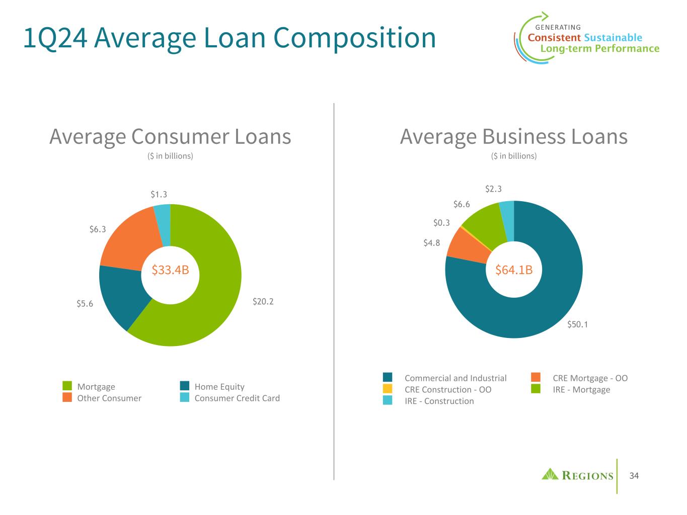 33 • Avg and ending loans decreased modestly QoQ • Avg business loans declined ~1% as modest increases associated with the funding up of previously approved investor real estate construction loans were offset by declines in C&I lending ◦ ~$870M of C&I loans were refinanced off- balance sheet through debt capital markets • Avg consumer loans remained flat as growth in residential mortgage, EnerBank and consumer credit card were offset by declines in home equity and run-off portfolios • Expect 2024 average loan balances to be stable to down modestly compared to 2023 Loans Softening demand but continuing to support our clients $98.1 $98.4 $96.9 65.5 64.9 63.6 32.6 33.5 33.3 1Q23 4Q23 1Q24 $97.3 $98.3 $97.4 64.9 64.9 64.0 32.4 33.4 33.4 1Q23 4Q23 1Q24 Average Loans & Leases ($ in billions) Business LoansConsumer Loans QoQ Highlights & Outlook Ending Loans & Leases ($ in billions)